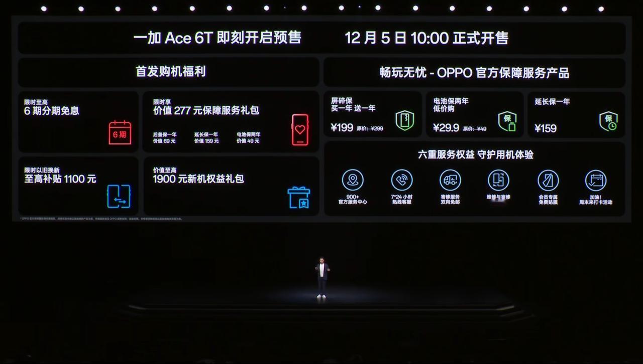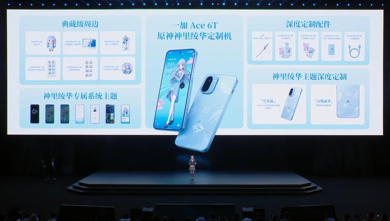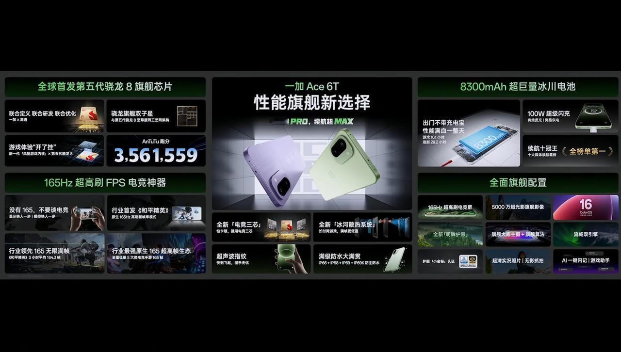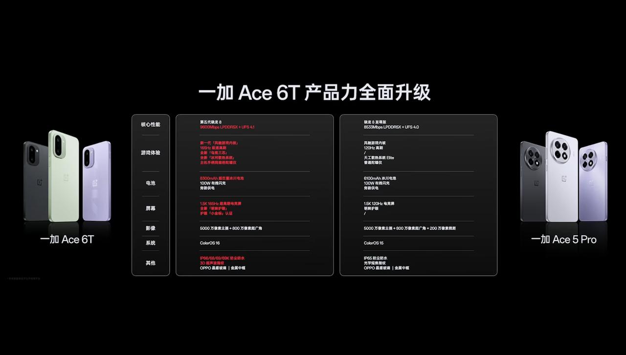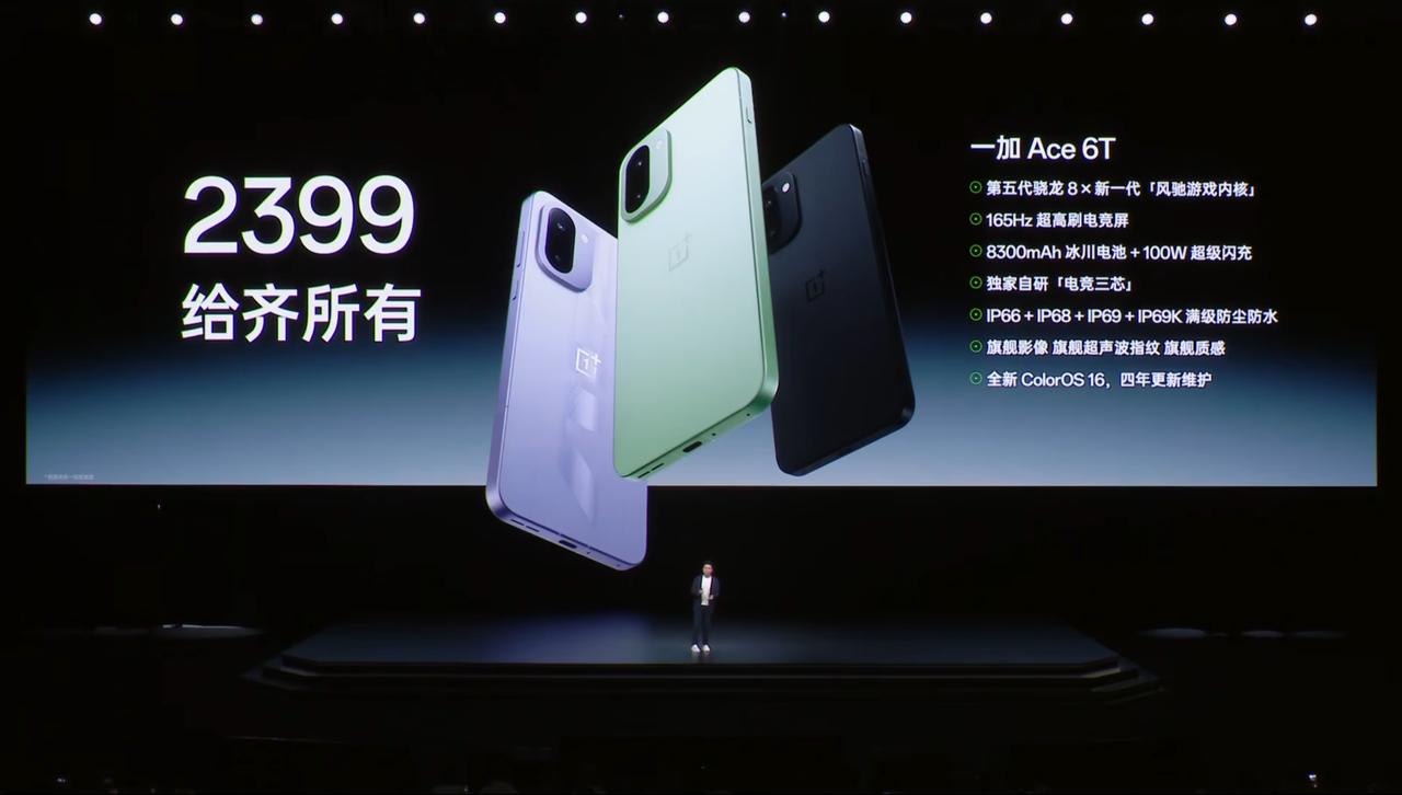 一加 Ace 6T 发布,相当于 Ace 6 的加强版,12+256GB 首销 2399 元、16+256GB 首销 2699 元、12+512GB 首销 2899 元、16+512GB 首销 3199 元、16GB+1TB 首销 3699 元,原神神里绫华定制版 16+512GB 首销 3699 元。[吃瓜群众] - 芯片:首发骁龙 8 Gen 5 移动处理平台(台积电 3nm N3P,CPU:2×3.8GHz Oryon-L + 6×3.32GHz Oryon-M,GPU:Adreno 829 1225MHz),LPDDR5X Ultra 内存(至高 9600Mbps),UFS 4.1 闪存,全新风驰游戏内核,冰河散热系统(散热总面积 43940mm²,冰河 VC),自研电竞网络芯片 G2、灵犀触控芯,自研 Display P3 屏幕芯片; - 屏幕:6.83 英寸 2800×1272 OLED 直屏,25% 窗口局部激发亮度 3600nit,支持 165Hz 刷新率(LTPS,1-120Hz 自适应刷新),330Hz 五指采样率,290Hz 十指采样率,3200Hz 瞬时触控采样率,支持全亮度 DC 调光+ 3840 PWM 调光,超声波指纹识别,支持湿手触控,OPPO 晶盾玻璃; - 相机:前置 16MP(索尼 IMX480),后置 50MP 主摄(索尼 IMX906,OIS,1/1.56")+ 8MP 超广角(索尼 IMX355)双摄; - 续航:8300mAh 冰川电池(仿生技术球形硅碳负极材料),100W 快充,兼容 36W PD、55W PPS,支持旁路供电; - 其他:厚 8.3mm(电光紫厚 8.1mm),重 216g(电光紫重 211g、掠影绿 217g),闪速黑、电光紫、掠影绿 3 款配色,丝绸玻璃后盖(电光紫玻纤),铝合金金属中框,支持 Wi-Fi 7、蓝牙 5.4、NFC、红外遥控、超线性立体声双扬声器,游戏手柄级陀螺仪(200Hz 采样率),IP66 & IP68 & IP69 & IP69K 防尘防水,搭载基于 Android 16 的 ColorOS 16 系统。