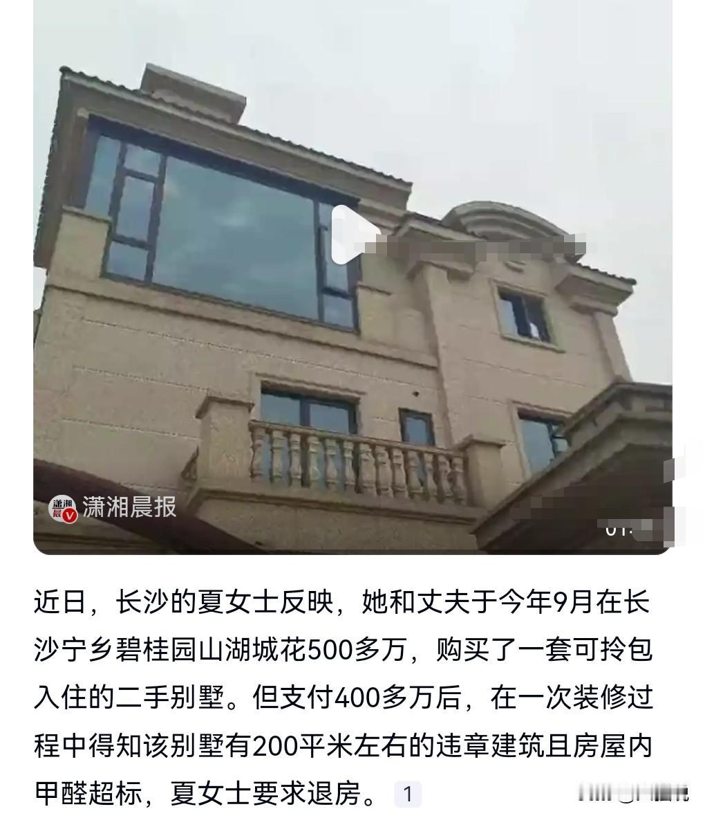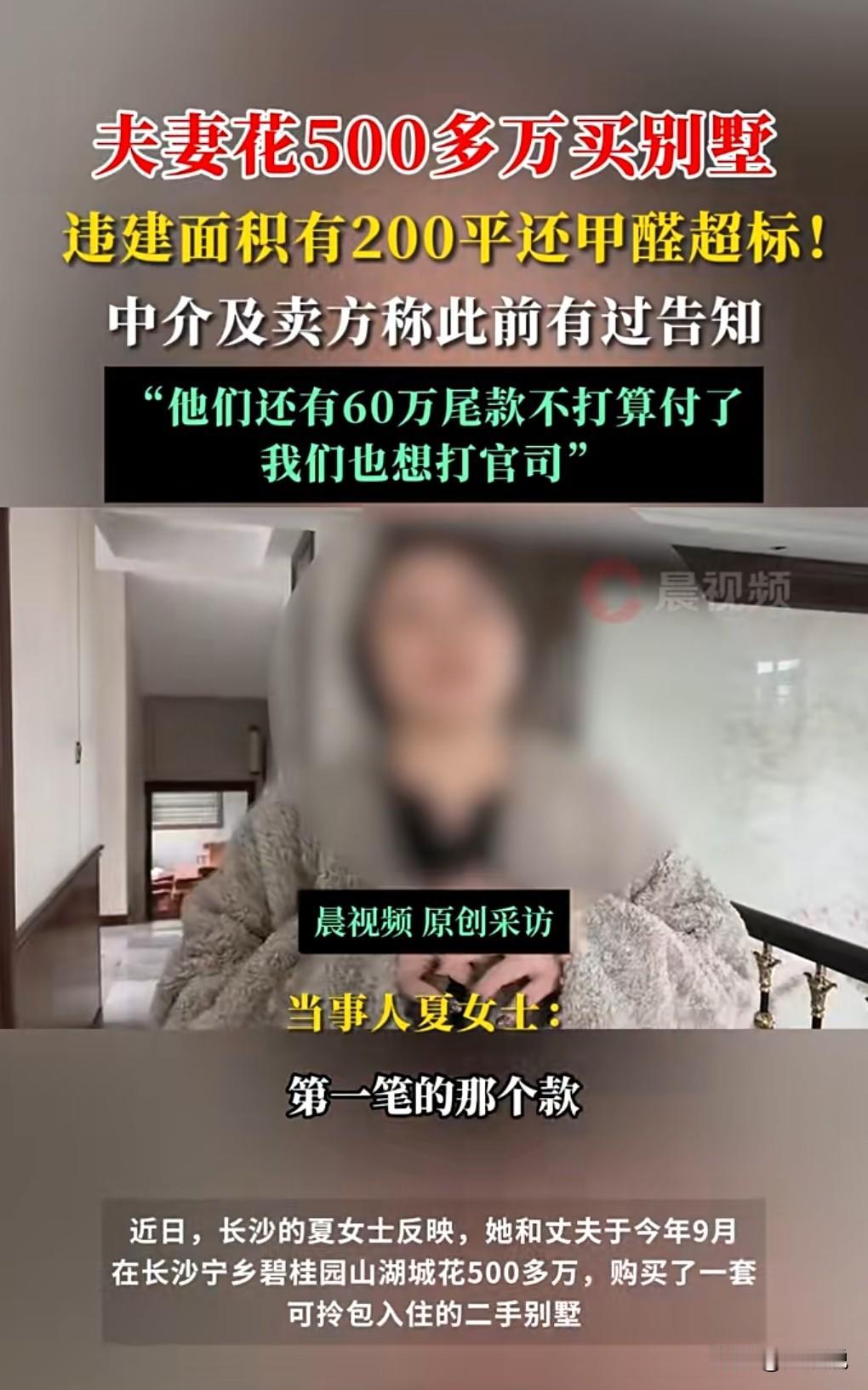 到底是谁在撒谎? 近日长沙一女子反映,花500多万买别墅,违建面积200平。 并且还存在甲醛超标的问题。 这就相当的可怕了。连健康都没得保障,谁敢住啊? 买家要求退房。 而中介说卖家曾经将情况告诉过买家。 那么谁在撒谎骗我? 由于还有一笔60万的尾款没付。 多方都已经决定用法律程序来维权。夫妻花500多万买别墅 违建面积200平