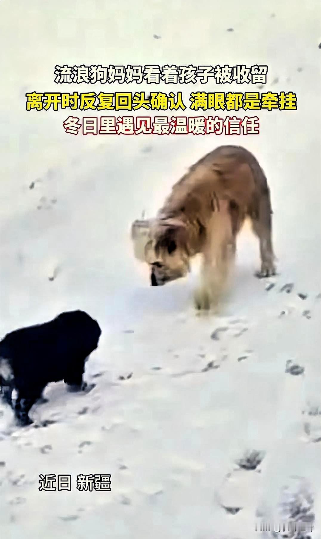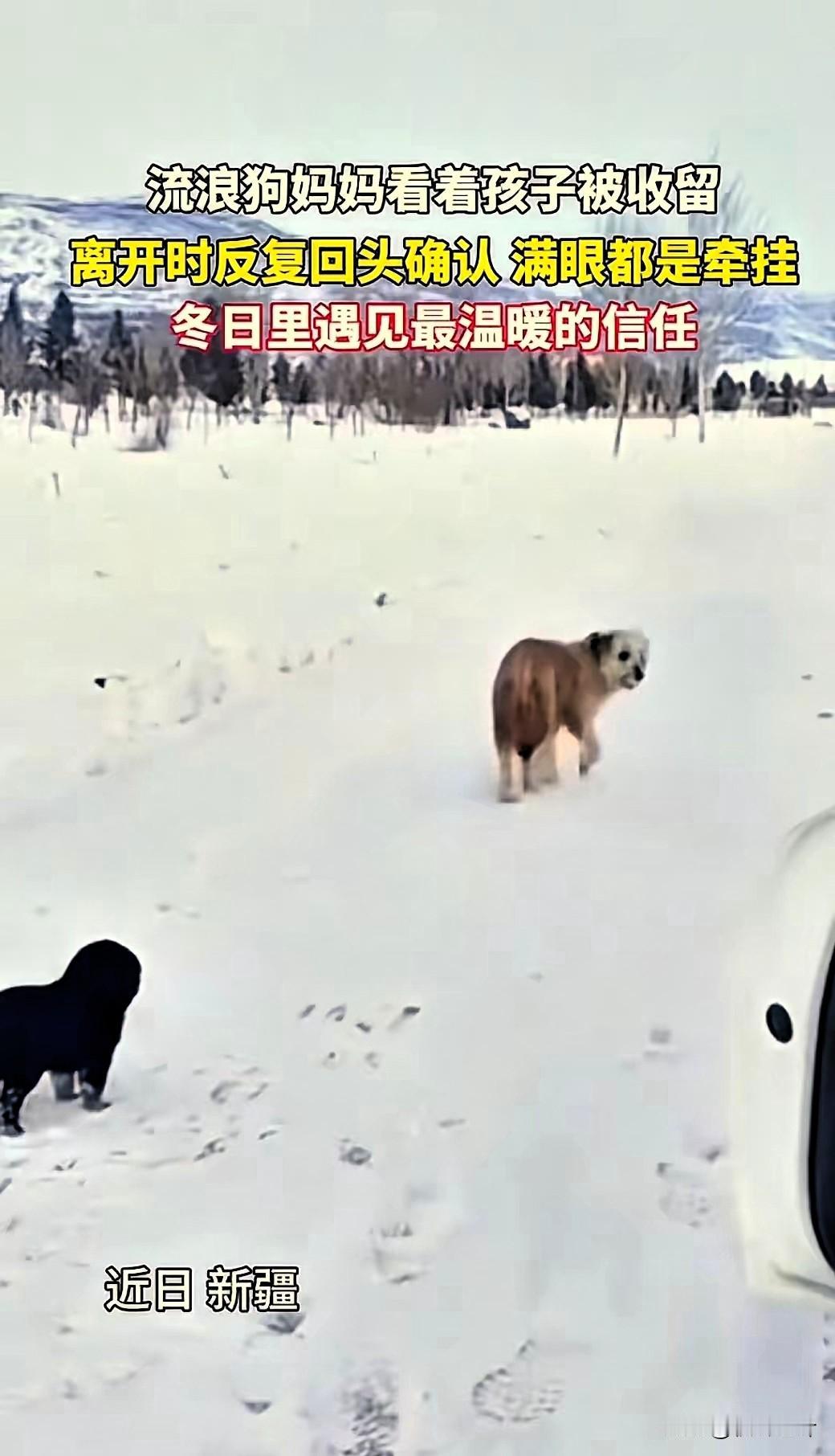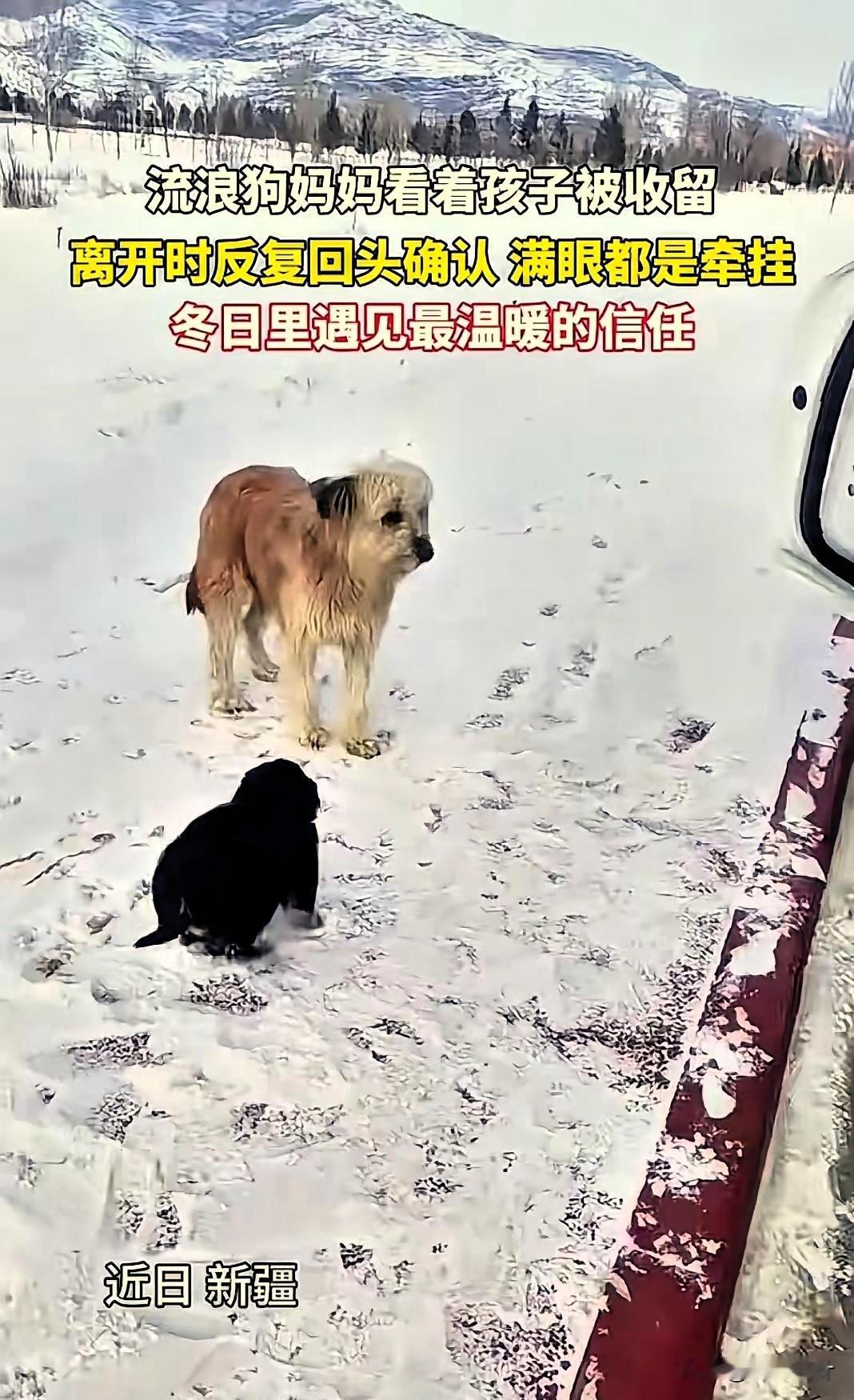 “看哭了!”新疆,一车主刚在路边停下休息,接下来的一幕让他直接傻眼了:两只流浪狗突然跑到车前,雪地里流浪狗妈“托孤” 这一幕让全网破防 据鞍山云12月3日报道,当时车主正带着妻子和孙子外出赏雪景,刚在路边停稳车,就看到一大一小两只流浪狗朝着车子踉跄跑来。 起初他还满心疑惑,这么冷的天,狗妈怎么会带着幼崽出来挨冻,毕竟冰天雪地里根本找不到吃食,直到大狗小心翼翼地把小狗叼到他脚边,又不舍地蹭了蹭小狗的脑袋,他才猛然明白,这是走投无路下的“托孤”。 小狗似乎也察觉到了妈妈的意图,着急地往狗妈身边扑了几步,可大狗只是冲着它轻轻点头,后退两步又定定看向车主,像是下定了某种决心,毅然转身跑进了风雪里。 小狗追在后面嗷嗷叫唤,那一声声呜咽,听得人鼻尖发酸。车主的孙子最先反应过来,立马跳下车抱起小狗,开心地跑回车里,而远处的狗妈跑出去十多米,还在一步三回头地张望。 这一幕被传到网上后,瞬间引发全网热议。有人感慨万物有灵,狗妈竟懂得找心善之人托付孩子;也有人戳心地猜测,狗妈匆匆离开,或许是还有其他幼崽等着它回去照看。 更暖心的是,车主一家没止步于收留这只小狗,还特意折返原地,真的找到了狗妈和剩下的3只狗崽,将4只幼崽全部带回家,而狗妈也被当地好心牧民收留,一家犬都有了好归宿。 在我看来,这不仅是双向的善意,更是生命与生命的共情。狗妈赌上了对人类的全部信任,车主一家用行动接住了这份沉甸甸的托付,这份跨越物种的温情,比任何刻意编排的故事都动人。它也告诉我们,真正的善良从不是一时心软,而是力所能及的周全与负责。