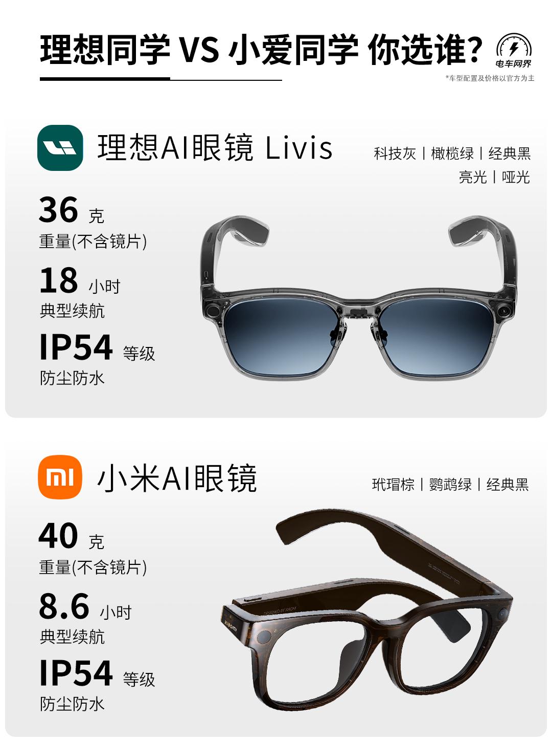理想也发布了自己的AI眼镜 Livis,定价1999元起,现在还可以参加15%国补,最低1699元起。 和其他品牌主打办公、娱乐等单一场景不同,理想 AI 眼镜实现了“人车家生态联动”。 全系标配蔡司定制镜片,行业最轻36g镜架,续航可达18.8小时,还可以跟理想汽车深度绑定,上车前语音就能远程开空调、解锁车门,行车时 AR 导航信息直接可以投在视野里,车辆哨兵模式的警报也能实时推送到眼镜上,把用车全流程做的更方便了。 这个价格基本小米AI眼镜一致,在价格相等的情况下,你会选择谁呢?【来自懂车帝车友圈】
