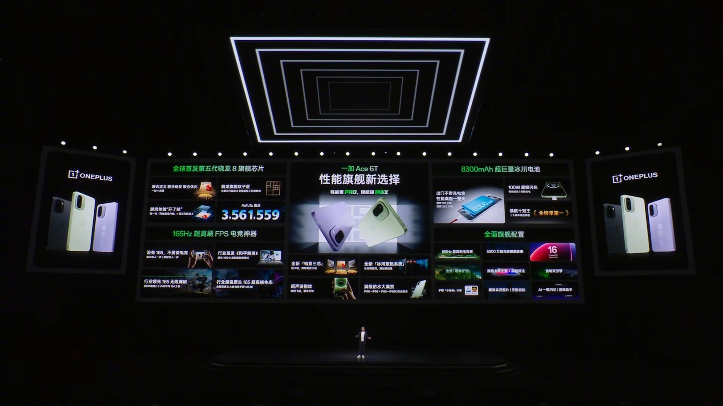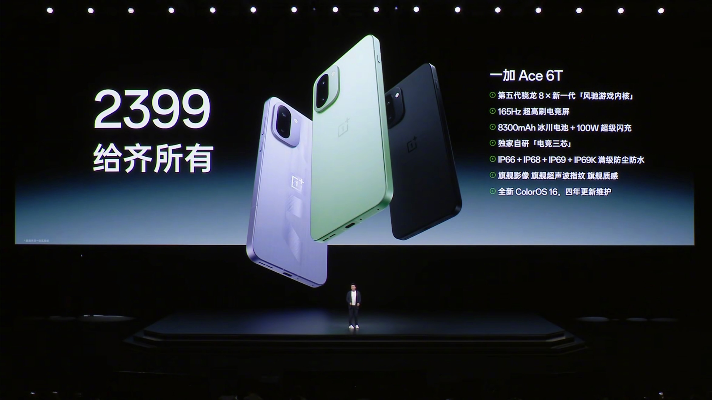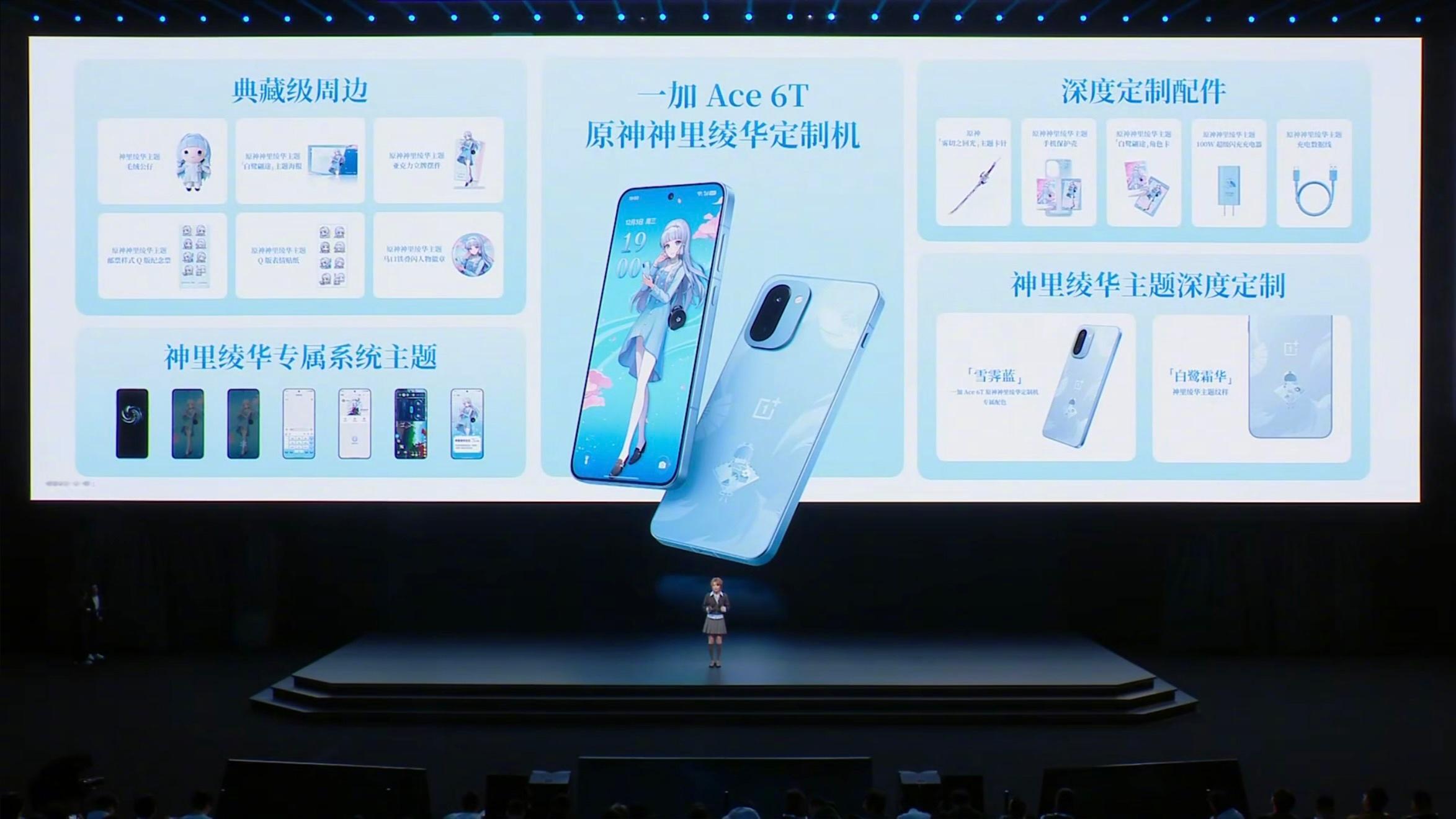 一加Ace6T一加Ace6T新品发布今晚,一加正式发布全新性能旗舰:一加Ace 6T。以“性能狠Pro、续航超Max”为核心定位,通过全新骁龙8 Gen5、8300mAh冰川大电池与165Hz电竞生态三大突破,重塑次旗舰性能上限。外观方面,Ace 6T提供闪速黑、掠影绿、电光紫三款配色,背盖哑光质感配合金属中框,整机厚度8.32mm、重量215g,在大电池机型中保持出色握持手感。机身实现IP66/68/69/69K满级防尘防水,更耐用更放心。3D超声波指纹支持湿手秒解锁,提升使用便利性。性能方面,Ace 6T全球首发骁龙 8 Gen5 芯片,基于台积电3nm工艺打造,安兔兔跑分高达356万。游戏实测表现突出:王者荣耀144帧模式功耗比骁龙8 Elite更低;原神在高负载场景下维持60帧以上,同时保持超低功耗。搭载一加自研的“风驰游戏内核”,可实现《和平精英》《三角洲行动》原生165帧运行,稳定性同档最强。操控方面,一加Ace 6T使用与一加15同款的200Hz陀螺仪,同PS5手柄规格,压枪精准度提升11%,延迟降低60%。灵犀触控芯片与电竞网络芯片G2带来更稳定的触控响应与网络体验,无论MOBA还是FPS皆能保持极致操作感。续航方面,Ace 6T配备8300mAh超巨量冰川电池,支持5年健康使用,5年后容量保持率≥80%。100W超级闪充可在15分钟回电约37%,不到1小时即可充满,并支持旁路供电,有效缓解电池老化,长时间游戏也能保持低温稳定,避免过热降频。屏幕方面,Ace 6T采用护眼电竞屏,全局峰值亮度达到3600nits,支持165Hz超高刷新率、1nit超暗亮度模式,通过德国莱茵护眼“小金标”认证。多款主流电竞游戏已适配165Hz帧率,王者荣耀更支持144帧+极致画质同开,画面流畅度与触控响应全面提升。本次发布会还带来与原神角色“神里绫华”的深度联名版本,采用「雪霁蓝」配色与专属纹理设计,并以光变工艺呈现独特剑舞光影。限定礼盒内含14款定制周边,包括主题卡针、角色卡壳与100W主题充电器等。系统界面也实现深度联动,涵盖UI动效、音效、开机动画以及语音提示,提供更沉浸的二次元体验。一加Ace 6T价格方面:12GB+256GB 2399元16GB+256GB 2699元12GB+512GB 2899元16GB+512GB 3199元16GB+1TB 3699元原神神里绫华定制版 16GB+512GB 3699元
