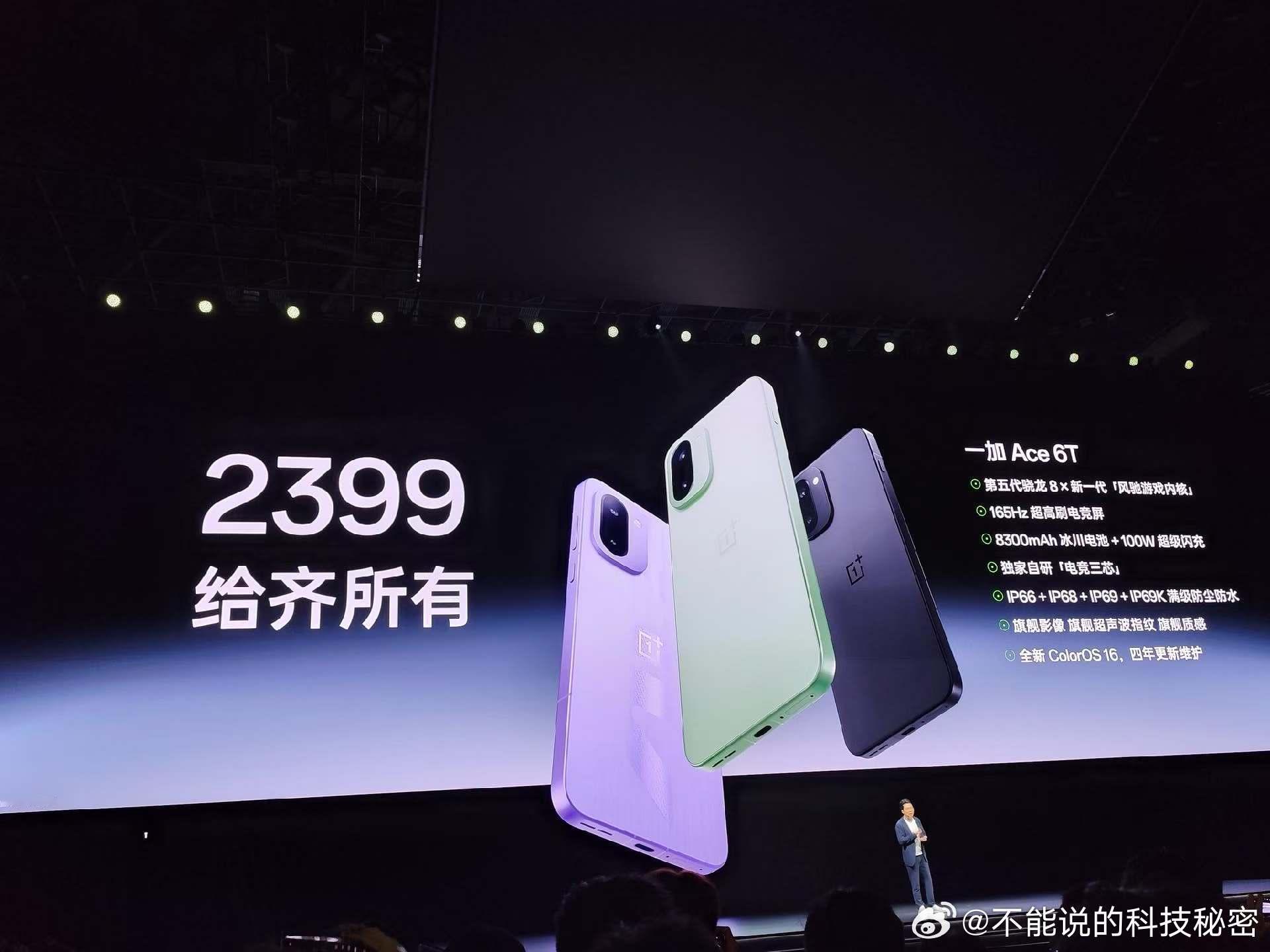 一加ace6t 一加Ace 6T全球发布:性能旗舰再升级 一加Ace 6T全球首发第五代骁龙8芯片,与高通联合研发,安兔兔跑分356万,性能稳居行业第一。搭载独家“风驰游戏内核”,支持165Hz极速高刷屏,并首发《和平精英》原生165帧模式,通过职业联赛测试。配备8300mAh超大电池与百瓦闪充,续航强劲。IP66/68/69/69K防水认证和超耐磨玻璃提升耐用性。运行ColorOS 16系统,AI功能丰富,确保四年流畅体验。影像方面采用5000万像素主摄,支持光学防抖。