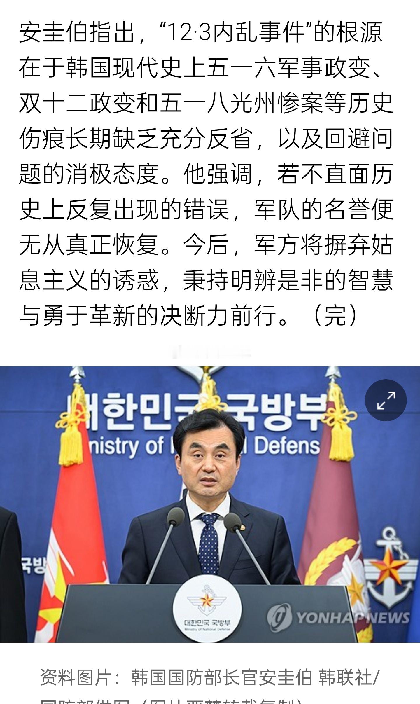 韩国国防部长官安圭伯2日在紧急戒严事件一周年前夕发文,就当时军队卷入内乱导致国民陷入安全风险等一系列事态,代表军方正式向国民致歉。安圭伯指出,“12·3内乱事件”的根源在于韩国现代史上五一六军事政变、双十二政变和五一八光州惨案等历史伤痕长期缺乏充分反省,以及回避问题的消极态度。他强调,若不直面历史上反复出现的错误,军队的名誉便无从真正恢复。今后,军方将摒弃姑息主义的诱惑,秉持明辨是非的智慧与勇于革新的决断力前行。且看李老汉如何乘机清算韩国右派。