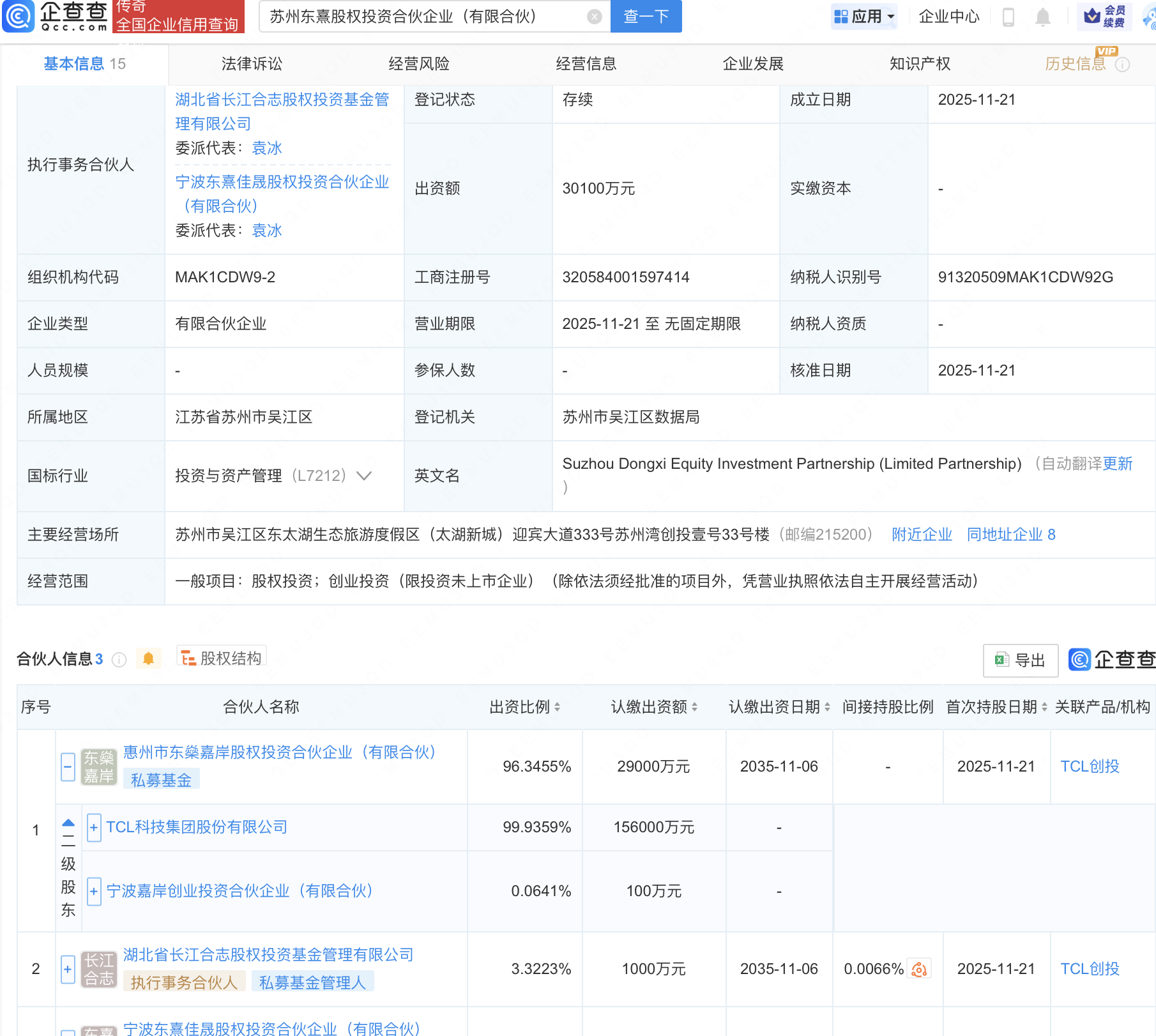 企查查APP显示,近日,苏州东熹股权投资合伙企业(有限合伙)成立,出资额3.01亿元,经营范围包含:股权投资;创业投资(限投资未上市企业)。企查查股权穿透显示,该企业由TCL科技(000100)旗下惠州市东燊嘉岸股权投资合伙企业(有限合伙)等共同出资。