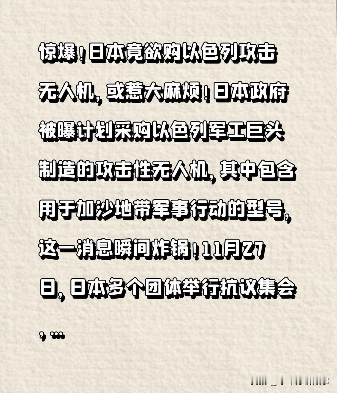 惊爆!日本拟购以色列攻击无人机,恐酿大祸! 据悉,日本政府有意采购以色列军工巨头制造的攻击性无人机,部分型号曾用于加沙军事行动,此消息一经传出便引发舆论热议。 11月27日,日本多个团体举行抗议集会,指出加沙行动涉嫌种族灭绝,采购相关武器或使日本沦为帮凶。专家警告,首相高市早苗或面临国际逮捕令。持续关注日本此举目的及后续国际影响!