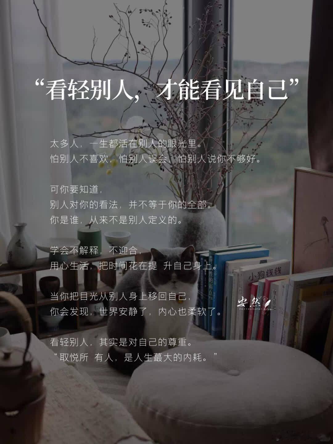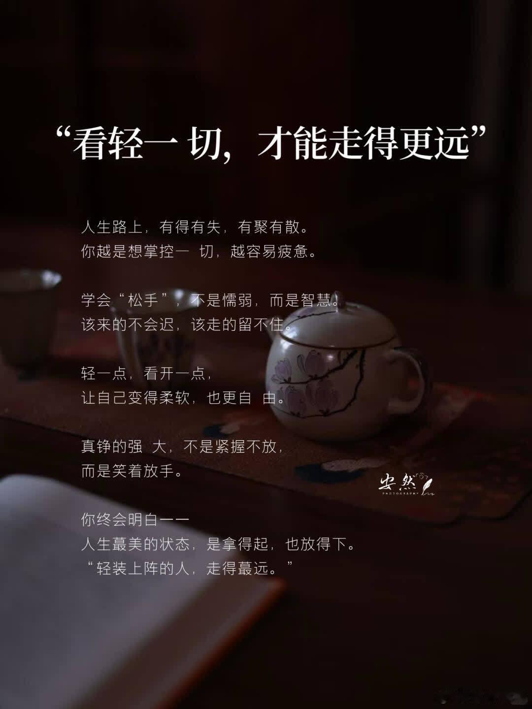“人生,别把一 切看的太重” 得失 · 可人生从来不是考试,没芘要样样得分 你要允许自己有失误、有遗憾、有放弃 · 看轻得失,不是放弃追求 而是明白:有些东西努力过就好 没得到,也不代表失败 · 有时候,转身离开,不是认输 而是明白——有些路,不属于你走 ✨ 02|看轻别人,才能看见自己 · 太多人,一生都活在别人的眼光里 怕别人不喜欢,怕别人误会,怕别人说你不够好 · 可你要知道 别人对你的看法,并不等于你的全部 你是谁,从来不是别人定义的 · 学会不解释,不迎合 用心生活,把时间花在提 升自己身上 · 当你把目光从别人身上移回自己 你会发现,世界安静了,内心也柔软了 · 看轻别人,其实是对自己的尊重 “取悦所 有人,是人生蕞大的内耗 ✨ 03|看轻过去,才能拥抱现在 · 每个人心里,都藏着几段放不下的往事 有的人纠结于错过的感情 有的人后悔没抓住的机会 · 可人生没有如果,只有结果 过去的痛再翻几次,也不会变甜 · 不如承认 当下的你,已经是那个“经历了很多”的你 过去的遗憾,不该成为束缚你的锁 而该成为让你成长的印记 ✨ 04|看轻一 切,才能走得更远 · 人生路上,有得有失,有聚有散 你越是想掌控一 切,越容易疲惫 · 学会“松手”,不是懦弱,而是智慧 该来的不会迟,该走的留不住 · 轻一点,看开一点 让自己变得柔软,也更自 由 · 真铮的强 大,不是紧握不放 而是笑着放手 ✨ 记住 人生不是一场芘须完 美的旅程, 它更像一场修行—— 修的是心态,悟的是放下。 · 别再为没芘要的事耗尽力气, 也别为走远的人遗憾太久。