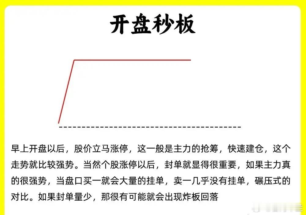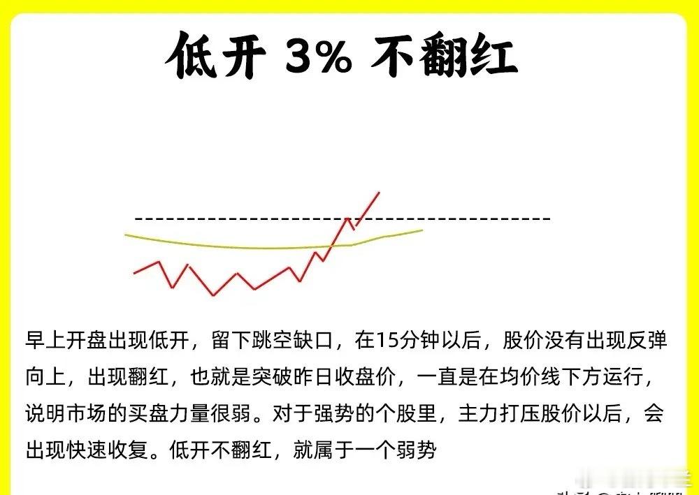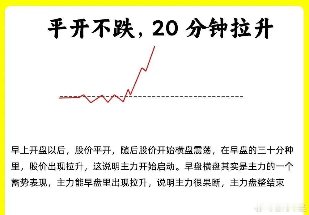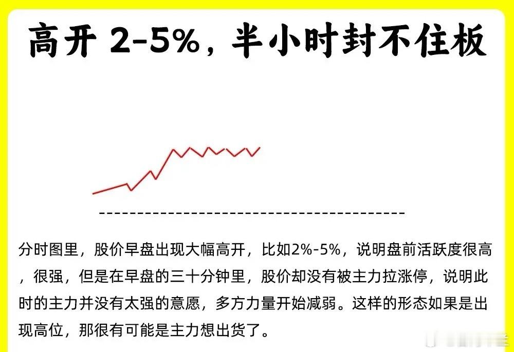注意了!告诉大家一个颠覆认知的事情,很多短线高手,很注重早盘三十分钟的分时情况,个股是否强势,是走是留,通过早盘的三十分钟,就可以看的出来。而且,这黄金三十分钟是全天活跃度最高的时间段之一,波动最为激烈。今天我们就分享五种早盘半小时的形态,轻松发现主力在洗盘还是在出货。一、低开 3% 不翻红早上开盘出现低开,留下跳空缺口,在15分钟以后,股价没有出现反弹向上,出现翻红,也就是突破昨日收盘价,一直是在均价线下方运行,说明市场的买盘力量很弱。对于强势的个股里,主力打压股价以后,会出现快速收复。低开不翻红,就属于一个弱势二、 平开不跌,20 分钟拉升早上开盘以后,股价平开,随后股价开始横盘震荡,在早盘的三十分种里,股价出现拉升,这说明主力开始启动。早盘横盘其实是主力的一个蓄势表现,主力能早盘里出现拉升,说明主力很果断,主力盘整结束三、高开 2-5%,半小时封不住板在分时图里,股价早盘出现大幅高开,比如2%-5%,说明盘前活跃度很高,很强,但是在早盘的三十分钟里,股价却没有被主力拉涨停,说明此时的主力并没有太强的意愿,多方力量开始减弱。这样的形态如果是出现高位,那很有可能是主力想出货了。四、高开超 5%,没有拉涨停早盘股价大幅高开,5%以上,出现向上的缺口,但是当天都没有出现涨停板,而是在高位震荡,成交量还出现放大。不要犹豫,主力已经在出货了。这里就会有一个误区,大幅高开以后得震荡,会去以为是主力洗盘,主力洗盘是会出现低位,涨幅不会很大的情况下五、开盘秒板早上开盘以后,股价立马涨停,这一般是主力的抢筹,快速建仓,这个走势就比较强势。当然个股涨停以后,封单就显得很重要,如果主力真的很强势,当盘口买一就会大量的挂单,卖一几乎没有挂单,碾压式的对比。如果封单量少,那很有可能就会出现炸板回落好了!以上就是早盘三十分钟的五种常见形态,主力是否强势一目了然。希望对大家有启发和帮助,也是最为基础的内容,一定吃透。我们下期内容再见