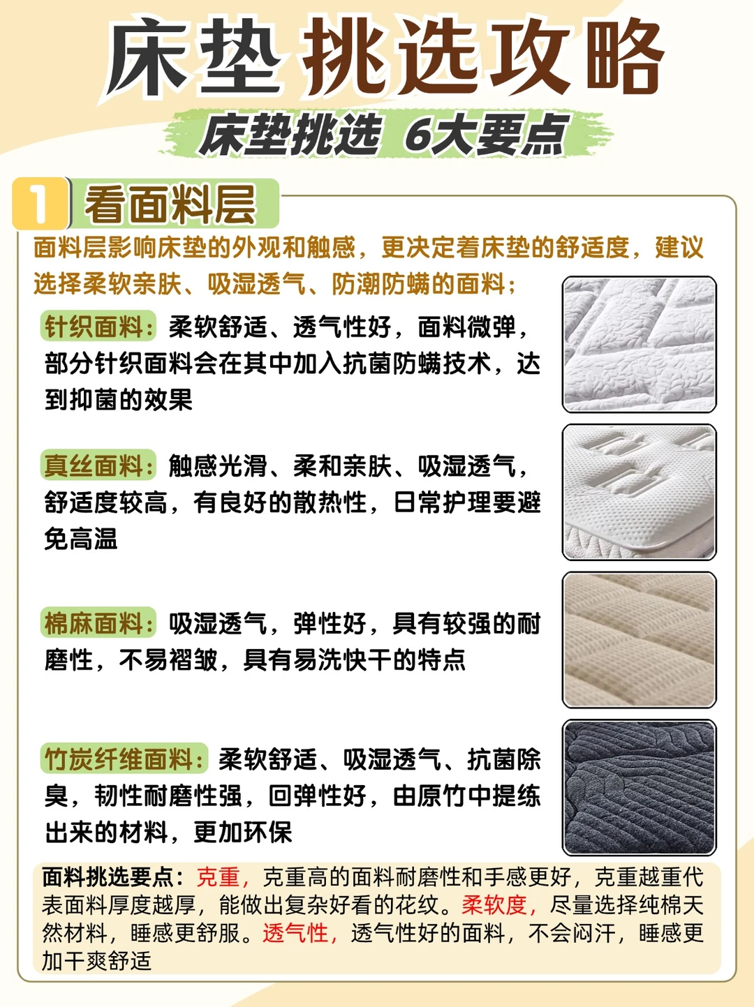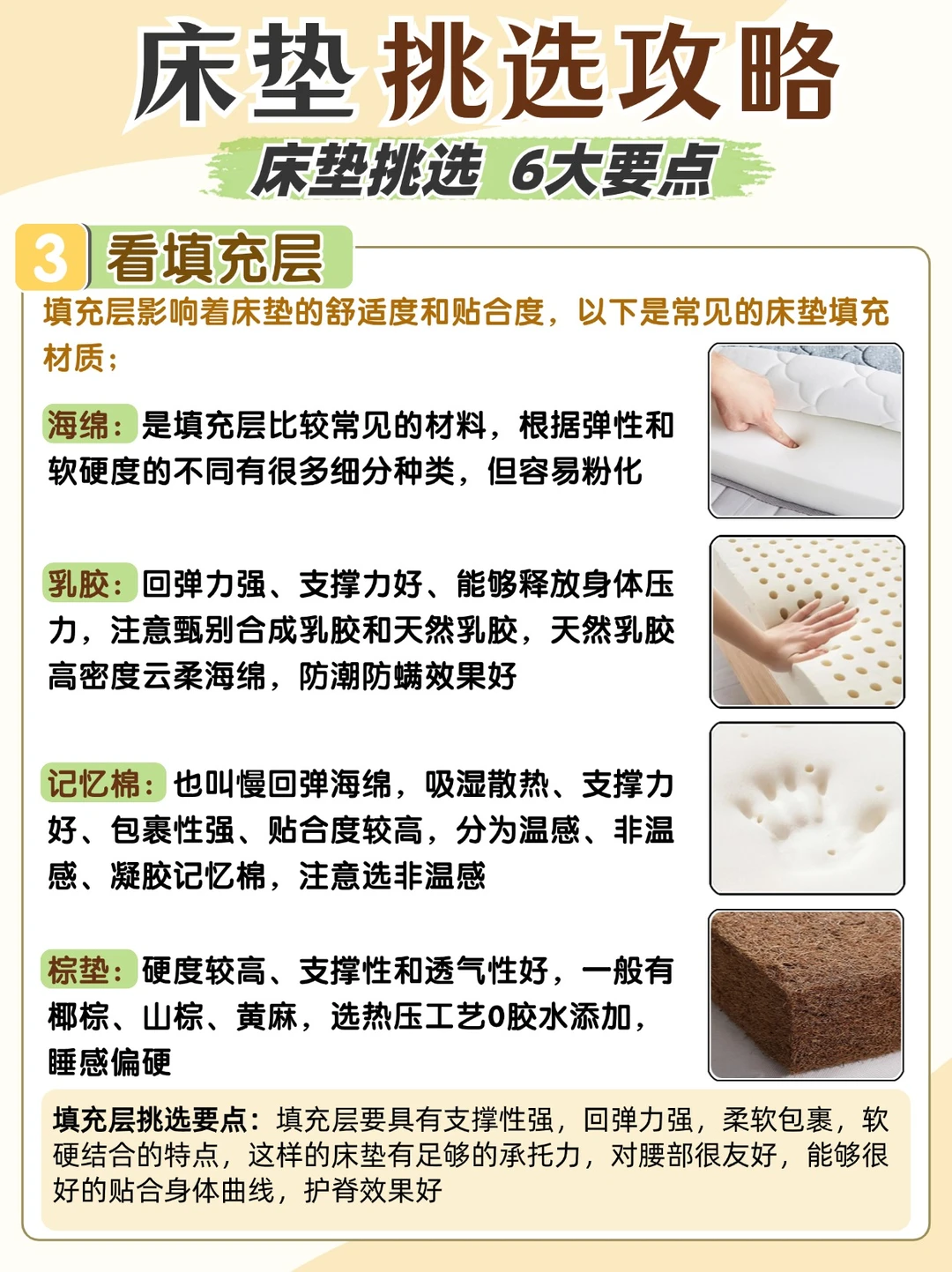 填充层要选择支撑性强,回弹力好的,软硬结合能给身体足够的承托力,能够更好的贴合身体曲线,对腰部和脊椎都很友好