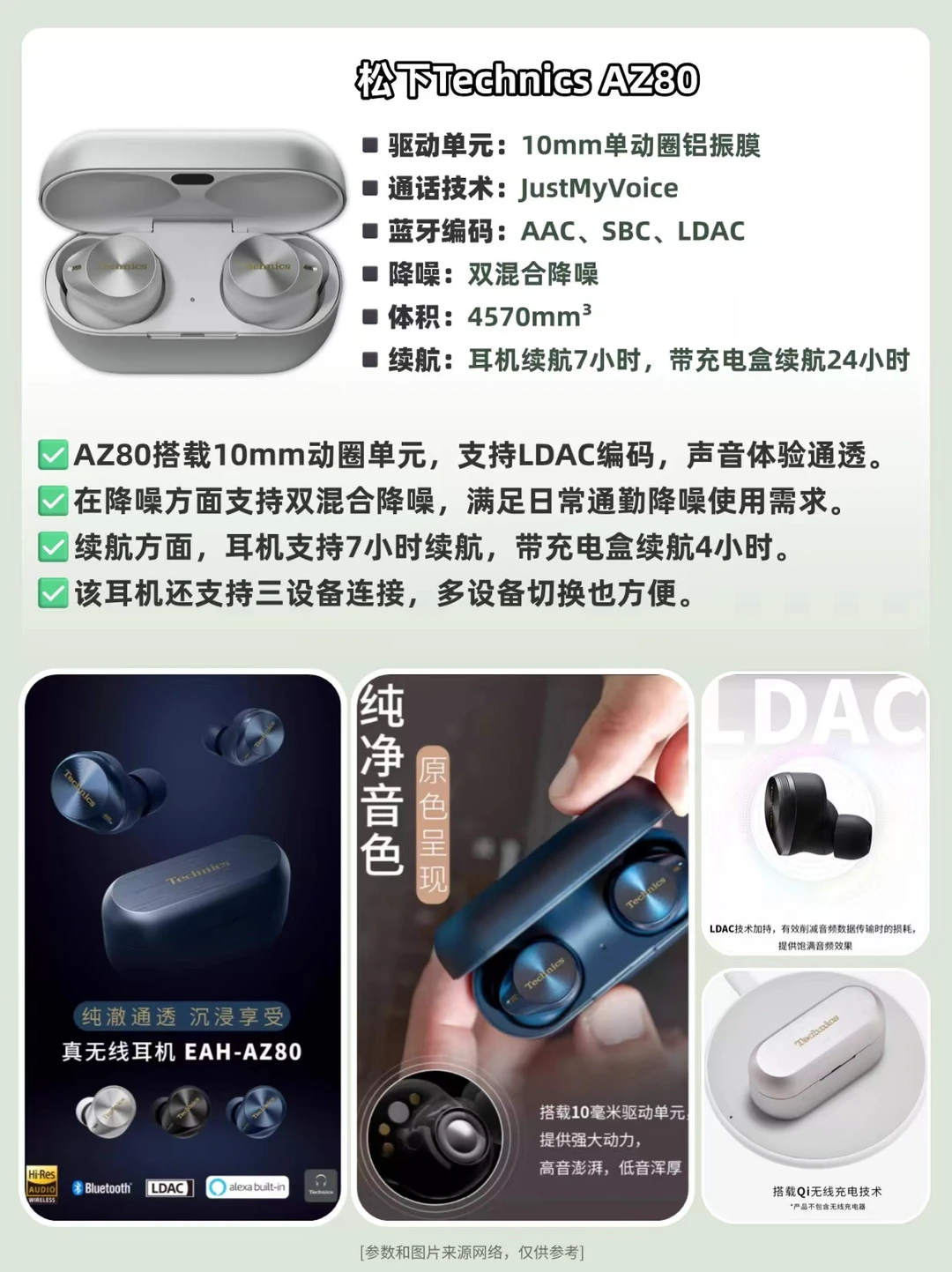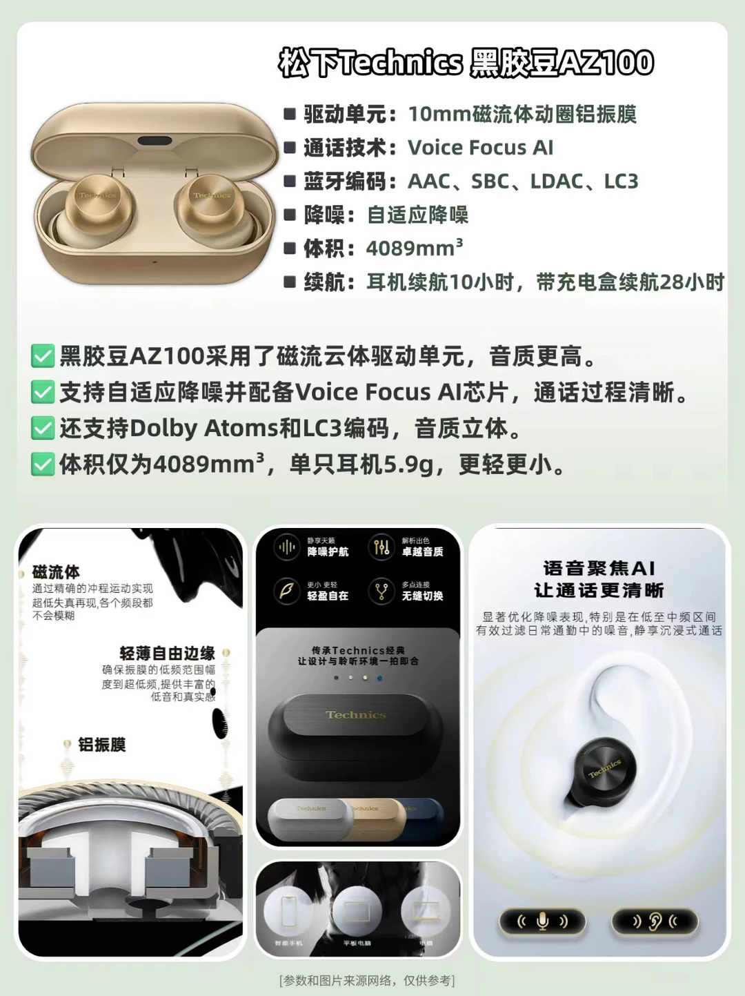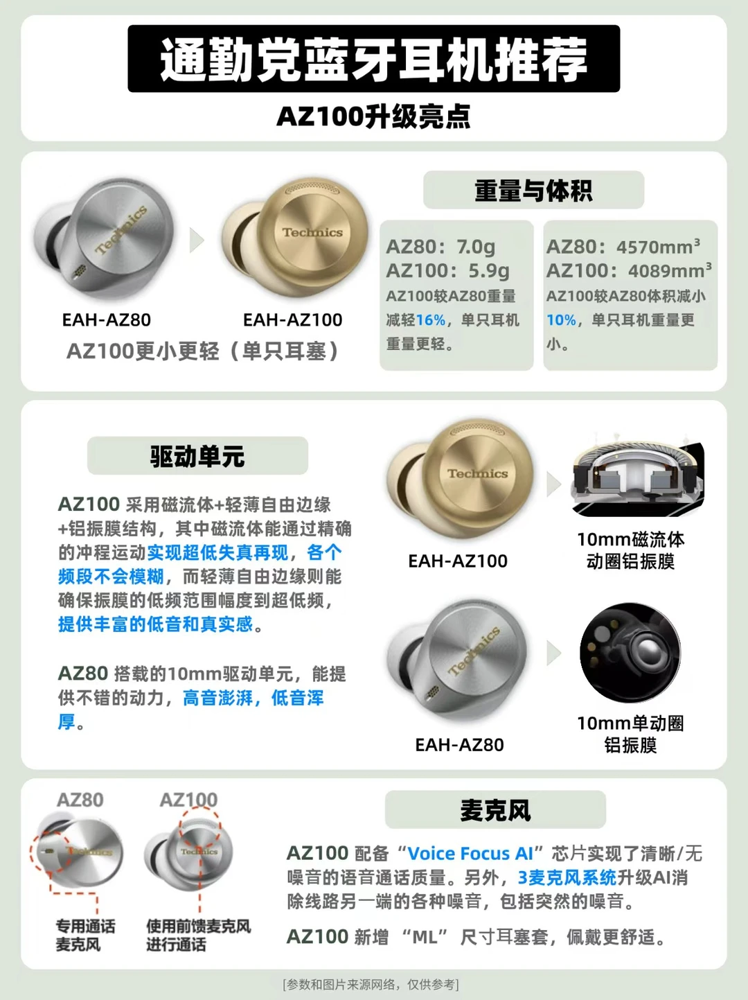 作为松下旗下高端音频品牌,Technics也有60多年历史,从做黑胶唱片机到转型HiFi音响,再以其在音频领域的沉淀开始推出推出🎧耳机,尝试在耳机产品上也还原黑胶充唱片的质感。 而近两年推出的AZ80和AZ100两款真无线耳机,可以说满足了音质党和降噪党的需求,那这两款耳机怎么选呢? 🎧Technics AZ80——均衡的“六边形战士” 🔹采用10mm动圈单元与LDAC高清编码,音质均衡通透 🔹双混合主动降噪技术,有效应对通勤环境噪音 🔹人体工学设计确保长时间佩戴舒适度 🔹支持三设备同时连接,多任务场景切换自如 👉适合追求音质、降噪与舒适度平衡的用户。 🎧Technics AZ100黑胶豆——旗舰体验 🔸搭载创新磁流体驱动单元,解析力更强,低频表现更澎湃 🔸动态自适应降噪系统,达成不错的降噪效果 🔸体积较AZ80缩小10%,重量减轻16%,佩戴更轻巧 🔸新增Voice Focus AI通话降噪芯片,配备ML尺寸耳塞 🔸提升至单次10小时/搭配充电盒达28小时 👉适合预算充足,追求音质与新技术的音乐发烧友及差旅人士。 ⭐️选购建议: 若追求全面均衡体验,AZ80是稳妥选择;若追求音质、降噪与便携升级,AZ100更值得投入。两款均代表Technics在黑科技与音频调校方面的深厚积淀。