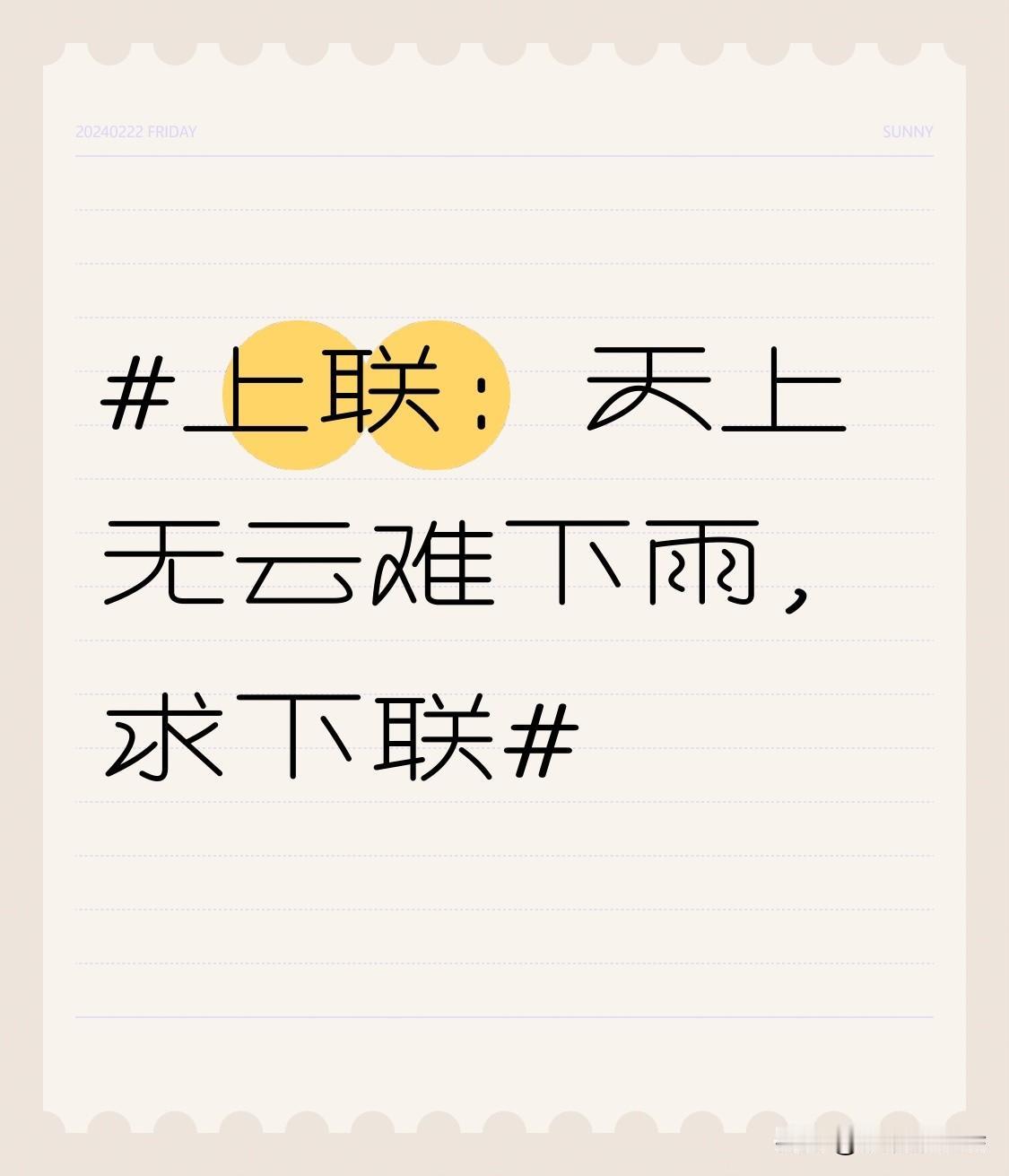 看到“天上无云难下雨”这个上联,感觉很妙,它把自然现象里云与雨的关联展现得明明白白。下联也有很多不错的。 像“山中有水自流泉”,描绘了山中水源源不断流出的画面,和上联一上一下,自然景象对仗工整。“人间有善易生和”就很有哲理,从自然转到人间社会,善良带来和谐,和上联的自然规律相呼应。“地中有水方成流”聚焦地下水源成流,和天上云下雨相互映衬。“心中有爱易行善”则从人生感悟出发,主观情感影响行为。不得不说,对对子真能让人感受到文字和思维的奇妙碰撞。