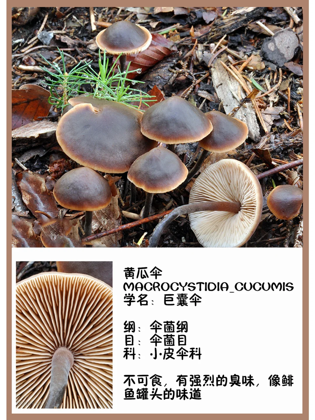黄瓜伞 macrocystidia_cucumis 学名:巨囊伞 纲:伞菌纲 目:伞菌目 科:小皮伞科 图片©manatarka.org ©josef hlasek 不可食,有强烈的臭味,像腐烂的黄瓜,也像鲱鱼罐头的味道[石化R]