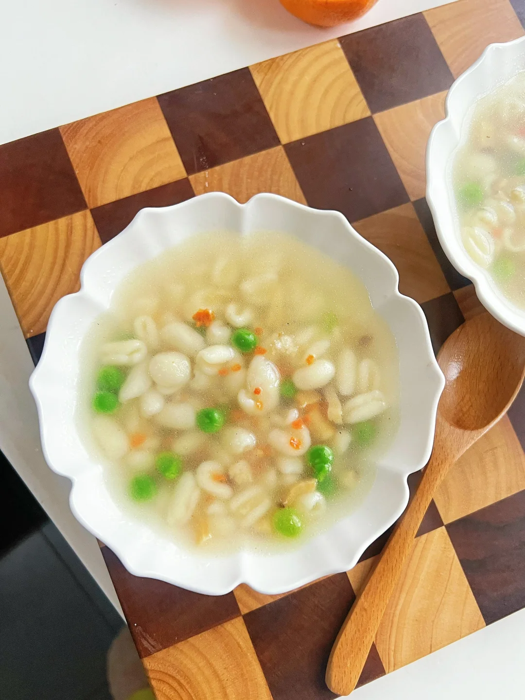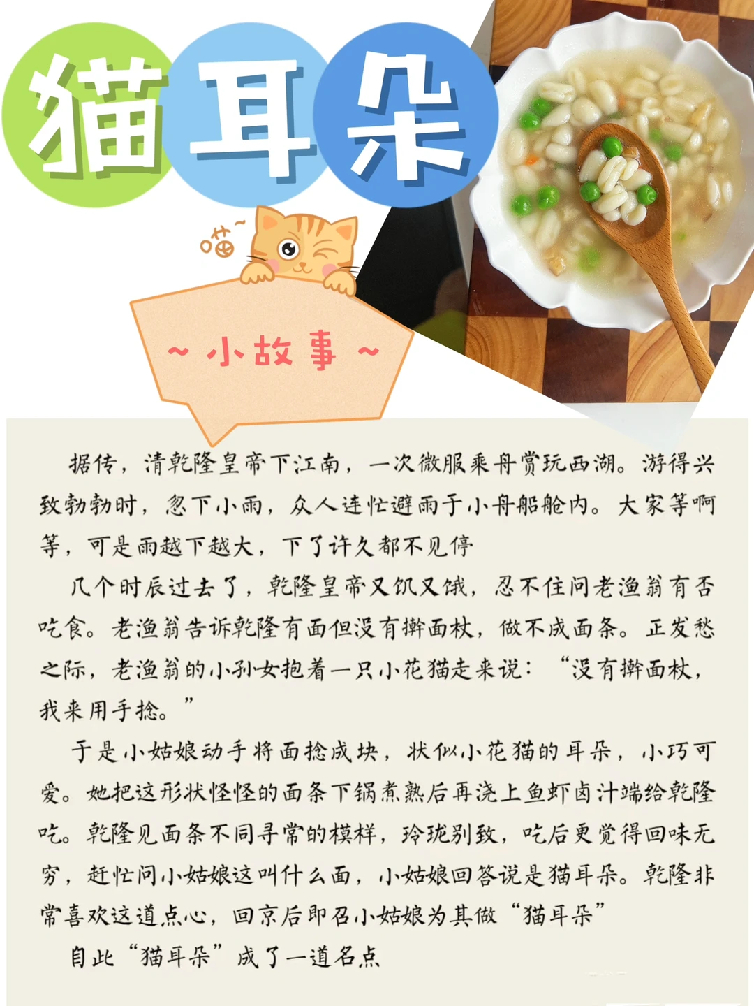 的三餐四季 今日的早餐超简单 猜一下是啥? 你吃过吗? ……………………………分割线……………………… 猫耳朵的名字来源于其特殊的形状,小巧玲珑,像小猫的耳朵一样可爱的小面疙瘩(我不会做,哈哈,买的成品)口感属于劲道的那种。 面瓣儿像猫耳,汤底里用了火腿丁、虾仁、鸡丁、干贝、甜豆 每一口都清爽而鲜美,值得尝试哦~
