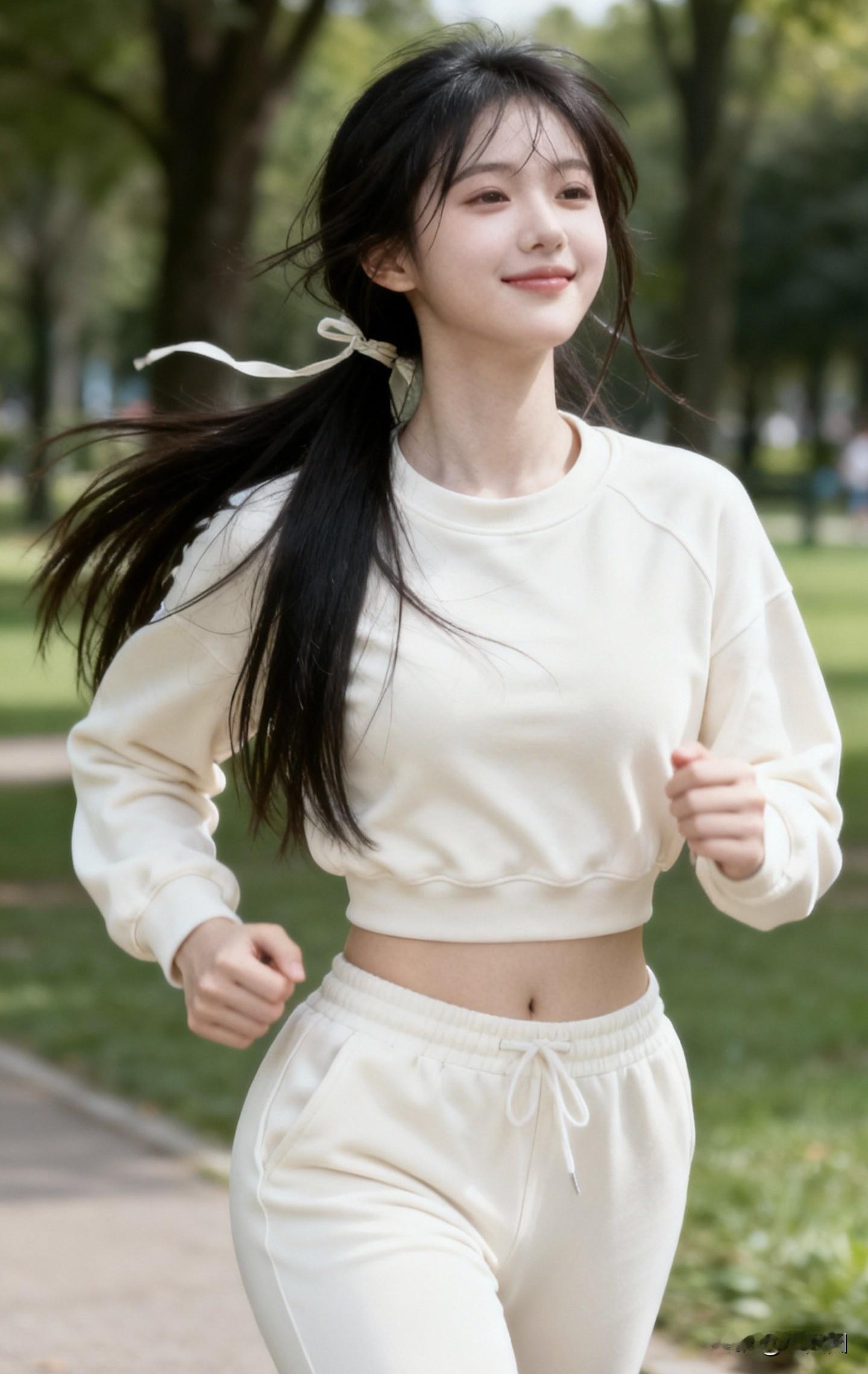高马尾上系了根黑色长丝带,随着跑动在风里飘,冷调黑中和了奶白的甜,让元气感里多了点清冷的小细节——不用刻意凹造型,风一吹头发和丝带一起晃,就是“电影感女主”的松弛心动。