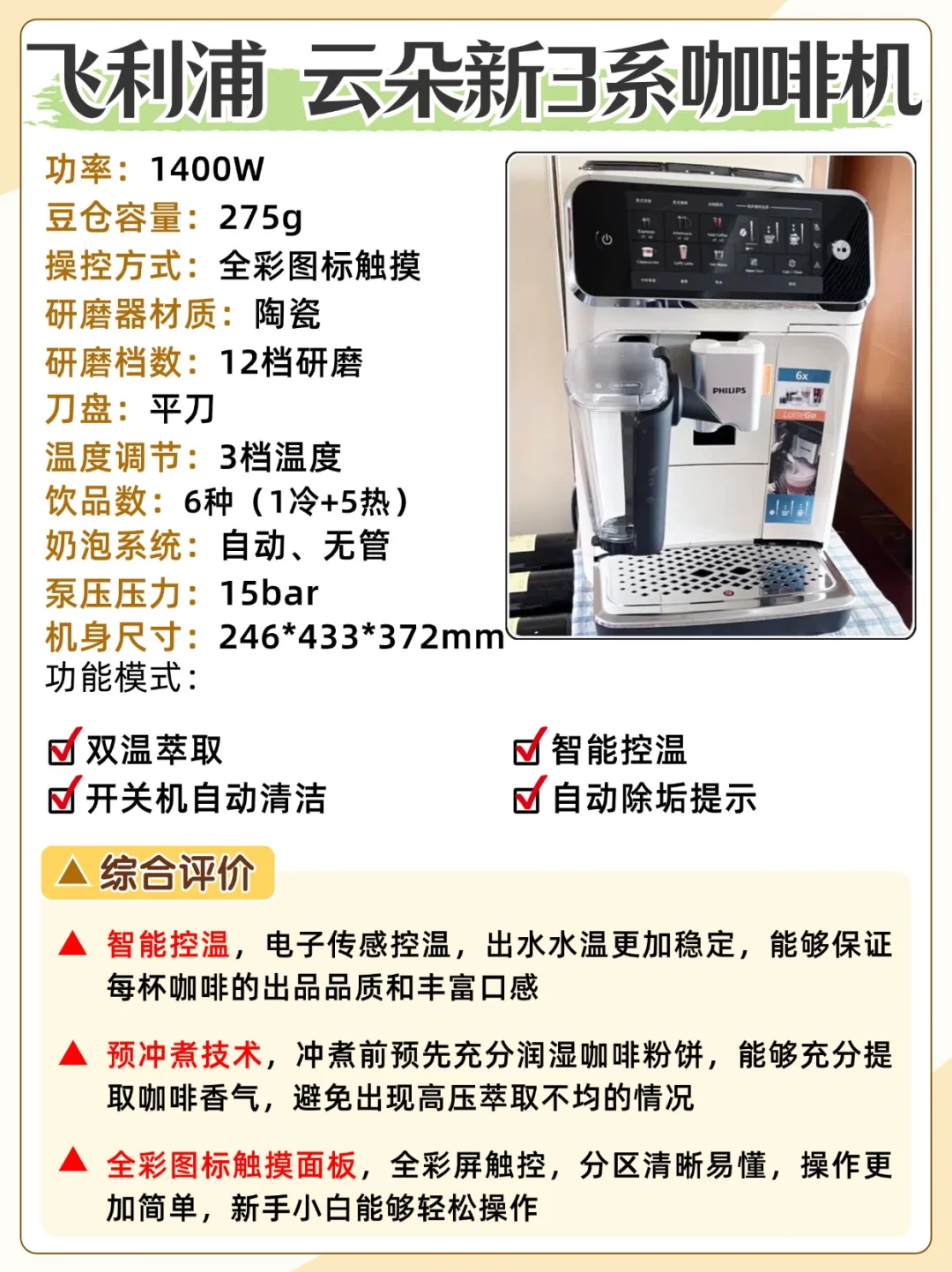 而对于早八人来说,全自动咖啡机能够在短时间内完成咖啡的制作,让我们在繁忙的早晨也能享受到一杯香浓的咖啡,使用更加省时省心~