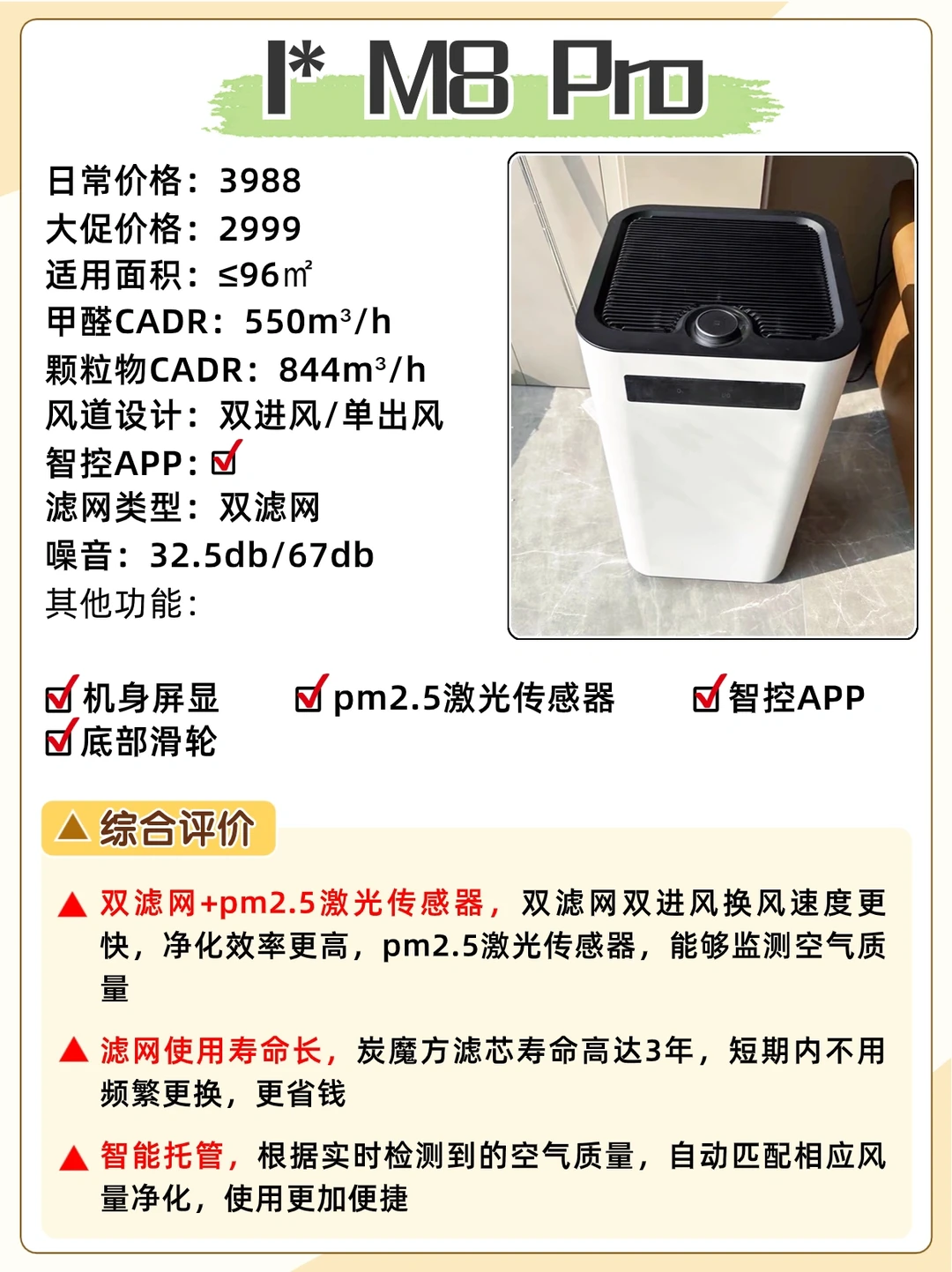 双滤网净化效率更高,双进风换风速度更快,pm2.5激光传感器,能够检测空气质量,使用更加安心