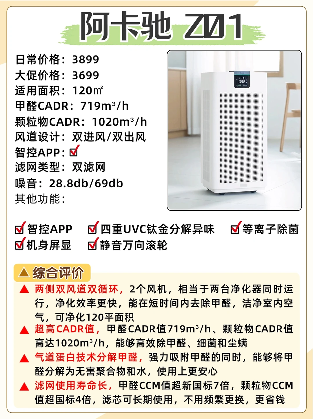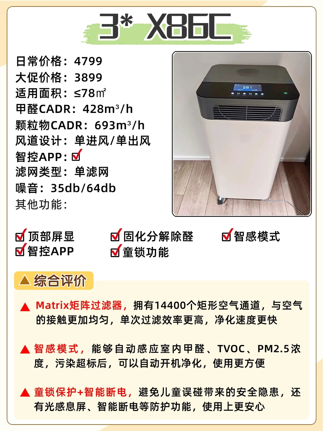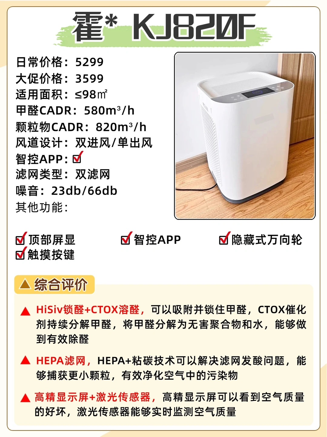 2个风机,净化效率更快,超高CADR值,能够有效净化甲醛、细J、尘螨,气道蛋白技术分解J醛,强力吸附J醛的同时,能够将J醛分解为无害聚合物和水,使用上更更安心,整体性能很不错!