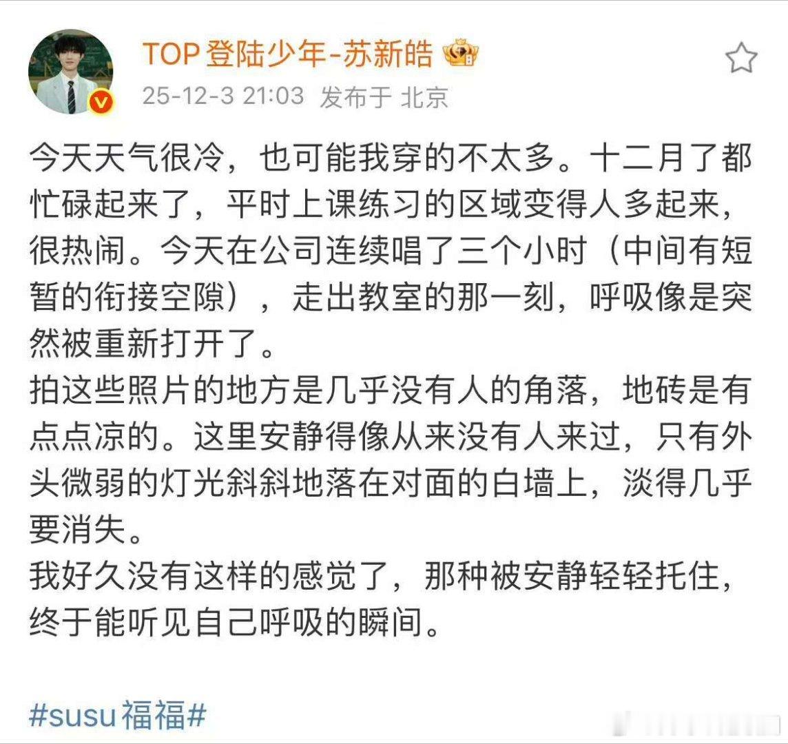 苏新皓终于能听见自己呼吸的瞬间 孩子就这样脚踏实地做自己很好在忙碌里偷来的宁静好戳人 为热爱拼的样子真的好燃三个小时连唱超拼!安静呼吸瞬间好治愈
