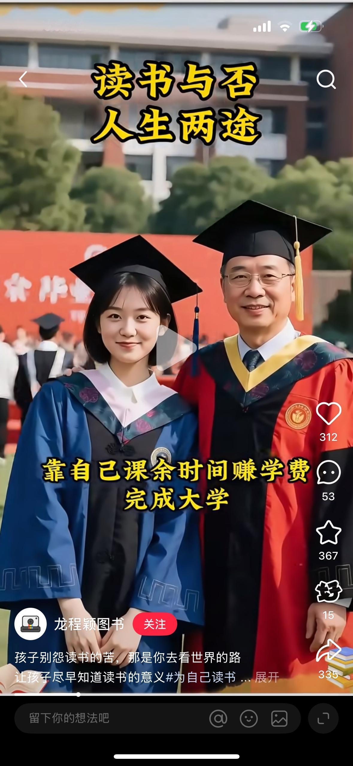 现在在社会上有一种心灵鸡汤教育孩子读书才有出路,看不起产业工人。中国每年出生的人口在1000万左右,我想问一下,如果这1000万人全部读了大学,哪有人来送外卖?谁来开公交车?谁在工厂的生产上线打螺丝呢,清华北大一年也只招四五千个学生,一千万人去竞争,也就是说1000个人里面只有一个人能够上清华北大。中国现在是一个制造业大国,并不需要这么多大学生,其实进入社会也是一个大学,比在学校里能得到的更深刻的东西,很多读书的孩子进入了社会也是碌碌无为。进入社会大学不断提升自己的欲望,绝对不会比上了大学的差。