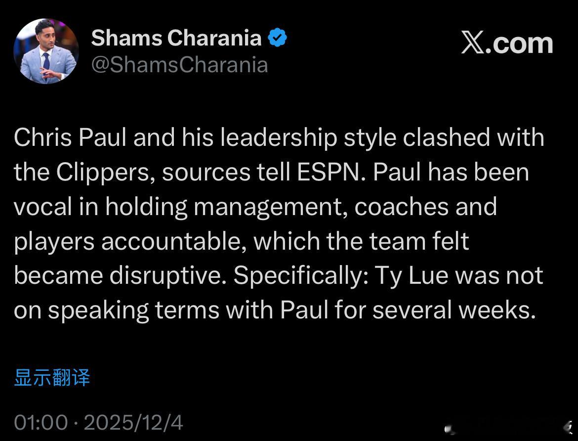 Shams:保罗的领导风格与快船产生了冲突。保罗一直以来都直言不讳地要求管理层、教练和球员承担责任,这让球队感到不安,具体来说,泰伦卢曾与保罗断绝联系数周。