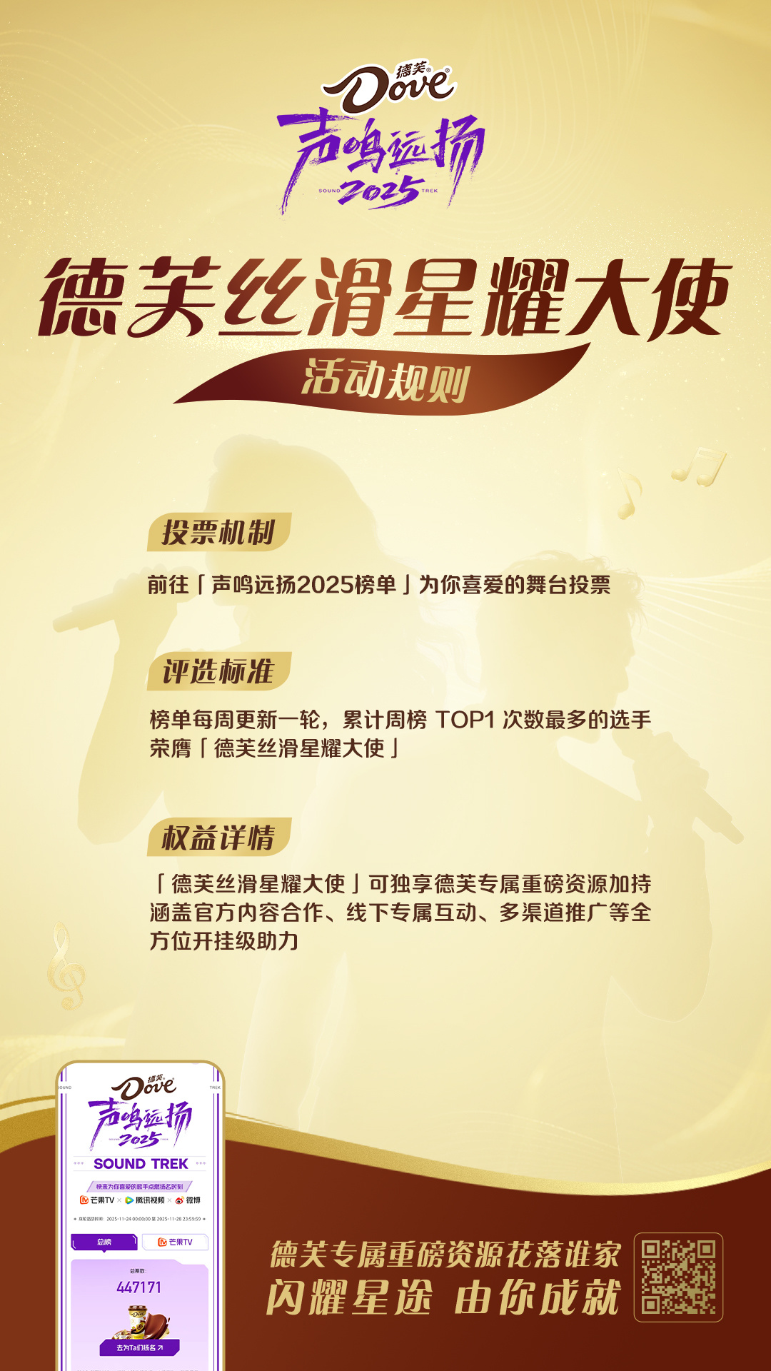 追声鸣远扬的宝子们看过来,你最心怡的选手能不能出道即拿商务,就看这次了!!德芙丝滑星耀大使虚位以待榜单「周排名第一」累计次数最多的选手,便可以解锁【德芙丝滑星耀大使】+专属重磅资源!这不就是明着给自推“喂饭”吗?!从舞台到商务一步到位,丝滑到像吃了德芙~(暗示到位了哈)而且哦,德芙全程陪跑节目,简直像养成系的“金主麻麻”,见证宝贝们成长!这波必须双向奔赴!德芙的商务真实在!这谁能不心动去争一下?德芙相伴音乐更丝滑愉悦更远扬