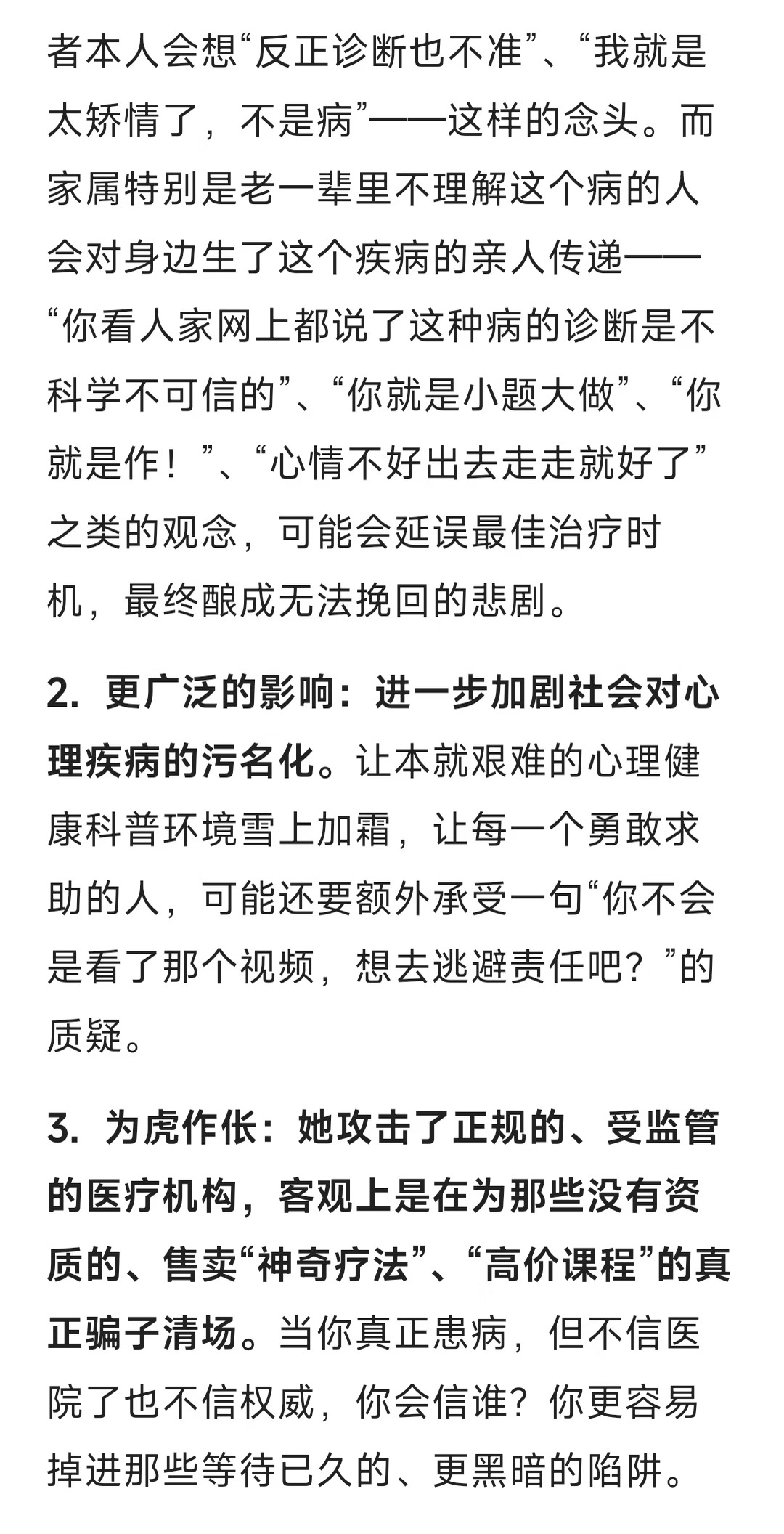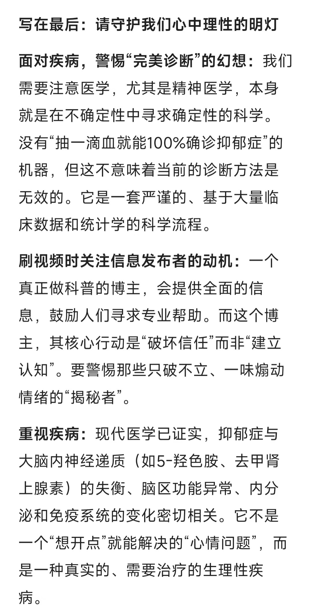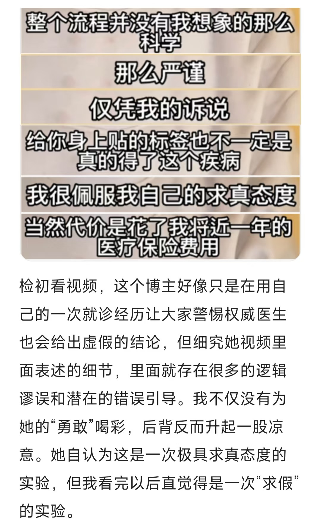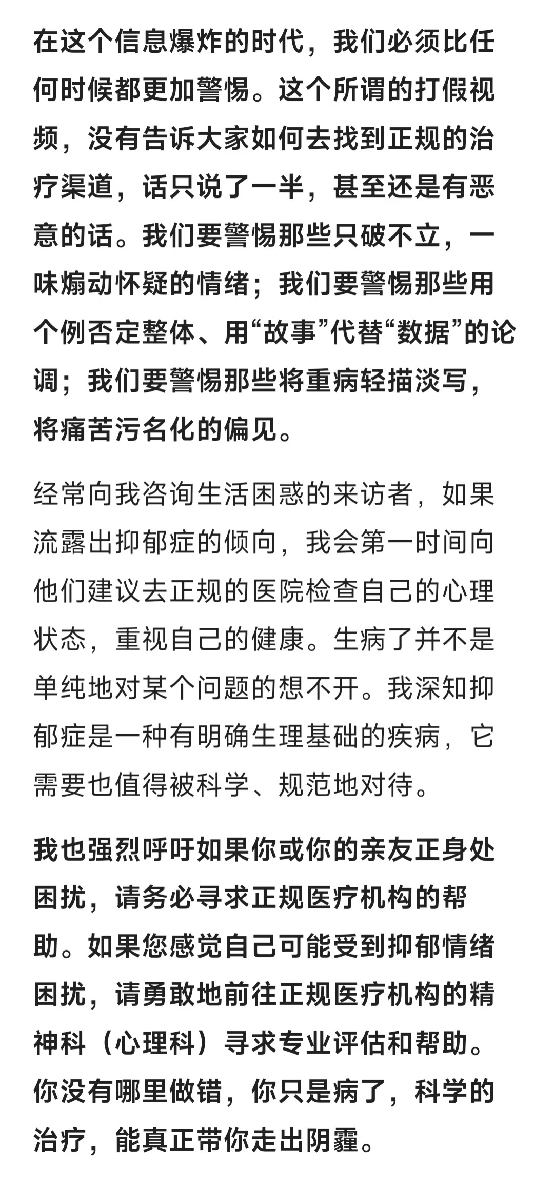 在这个信息爆炸的时代,我们必须比任何时候都更加警惕。这个所谓的打假视频,没有告诉大家如何去找到正规的治疗渠道,话只说了一半,甚至还是有恶意的话。我们要警惕那些只破不立,一味煽动怀疑的情绪;我们要警惕那些用个例否定整体、用“故事”代替“数据”的论调;我们要警惕那些将重病轻描淡写,将痛苦污名化的偏见。