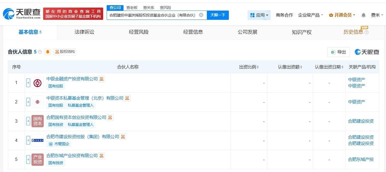 合肥建投、中银资产等成立股权投资基金出资额10亿 天眼查工商信息显示,近日,合肥建投中瀛扶摇股权投资基金合伙企业(有限合伙)成立,执行事务合伙人为合肥国有资本创业投资有限公司、中银资本私募基金管理(北京)有限公司,出资额10亿人民币,经营范围为私募股权投资基金管理、创业投资基金管理服务。合伙人信息显示,该基金由中银金融资产投资有限公司、中银资本私募基金管理(北京)有限公司、合肥国有资本创业投资有限公司、合肥市建设投资控股(集团)有限公司、合肥东城产业投资有限公司共同出资。 天眼查信息: