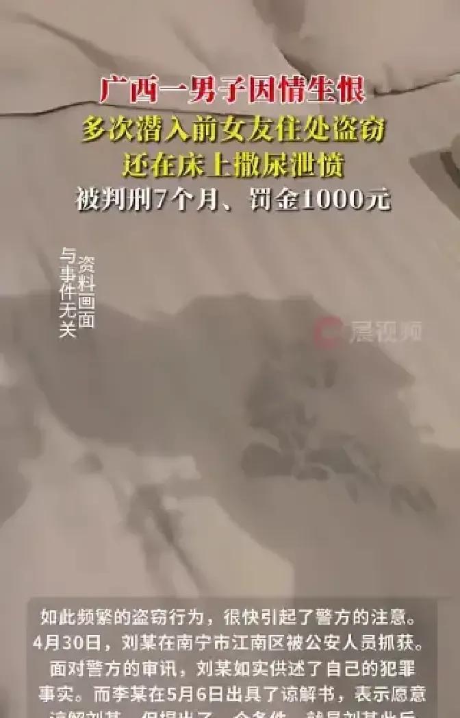 广西南宁刘某和女友散伙后仍揣着钥匙,半夜摸回人家租屋,先顺走六百块现金,再对准衣柜角落撒泡尿,监控把全程拍成高清教学片。 女生回家闻到味不对,调录像看见前任像逛自家厨房,翻抽屉翻床底还顺手抖鞋,她直接报警。 警察按图索骥把刘某拎走,法院两罪并罚,七个月加一千块,号子里过年。 感情黄了就该断得干干净净,钥匙不交还,情绪不收拾,最后把自己送进铁门,这波操作属实给前任送上最硬的安全感。 分手见人品,别拿爱情当通行证,越界一步就是罪犯。