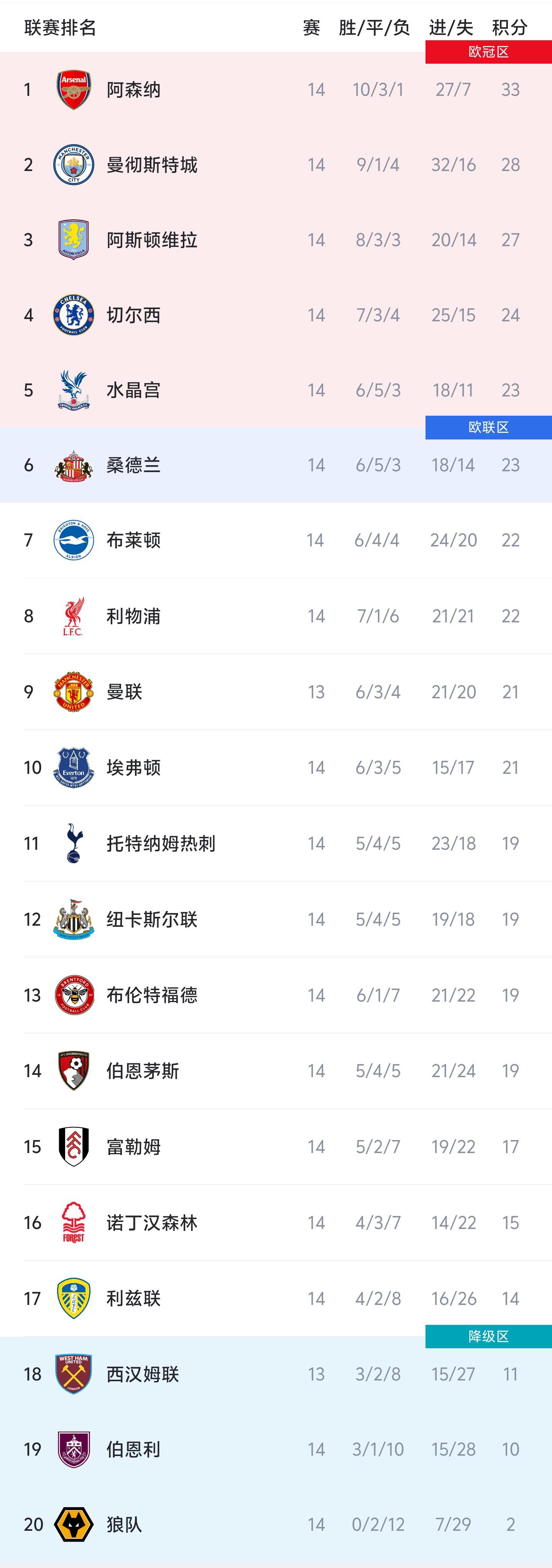 水晶宫在击败伯恩利后依然位列前五,利物浦则在主场没能赢下桑德兰,错失了重返积分榜前五的机会。