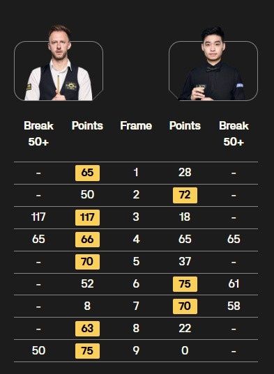 贾德·特鲁姆普打出一杆破百(117)和两杆50+(65、50),斯佳辉打出三杆50+(65、61、58),上半场过后贾德·特鲁姆普3-1领先斯佳辉,最终特鲁姆普6-3战胜斯佳辉,晋级8强。