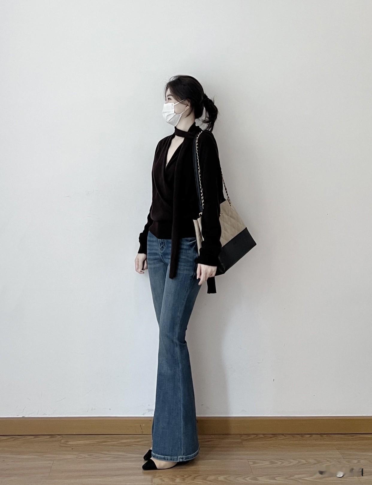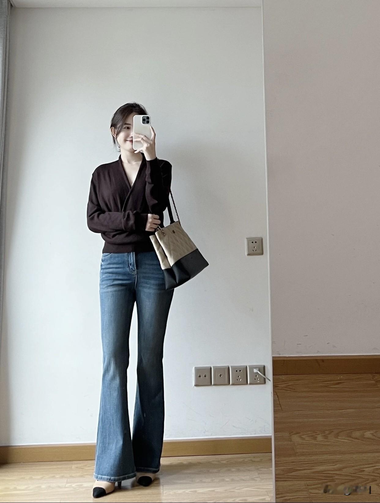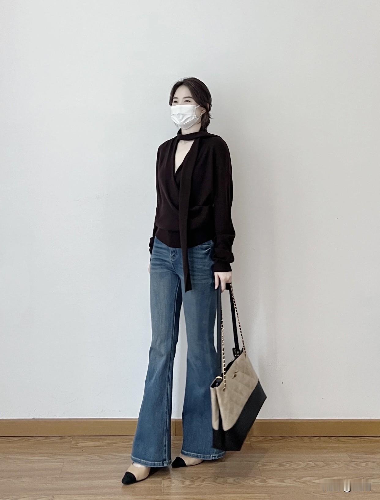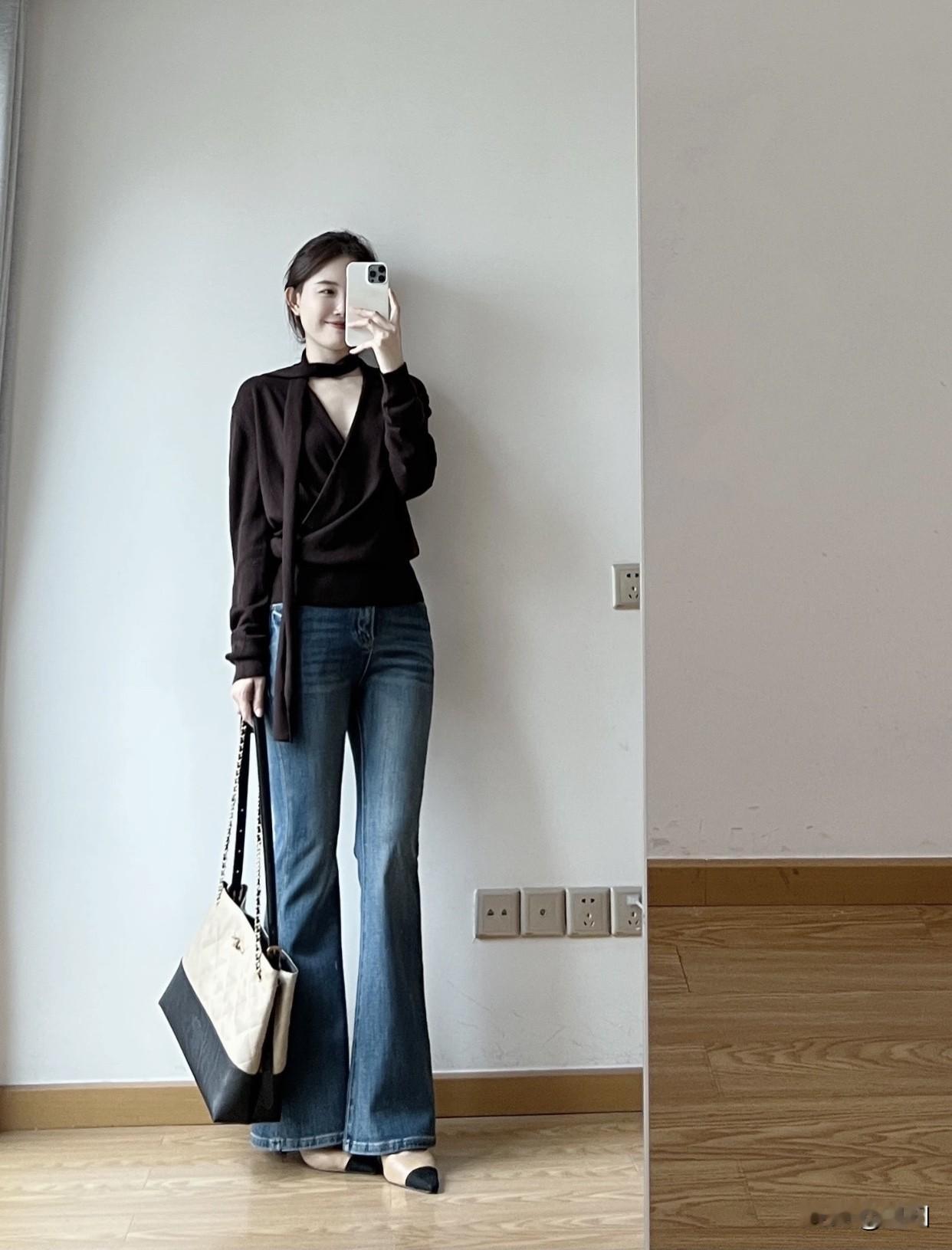 女生怎么穿紧身裤才好看简约时尚穿搭,紧身微喇牛仔裤+黑棕色上衣,搭配棕色拼接黑色高跟鞋,优雅气质满分!简约好看👗👠