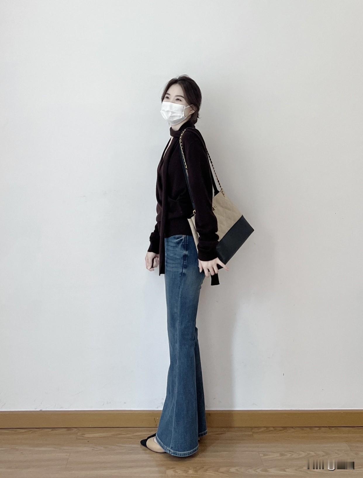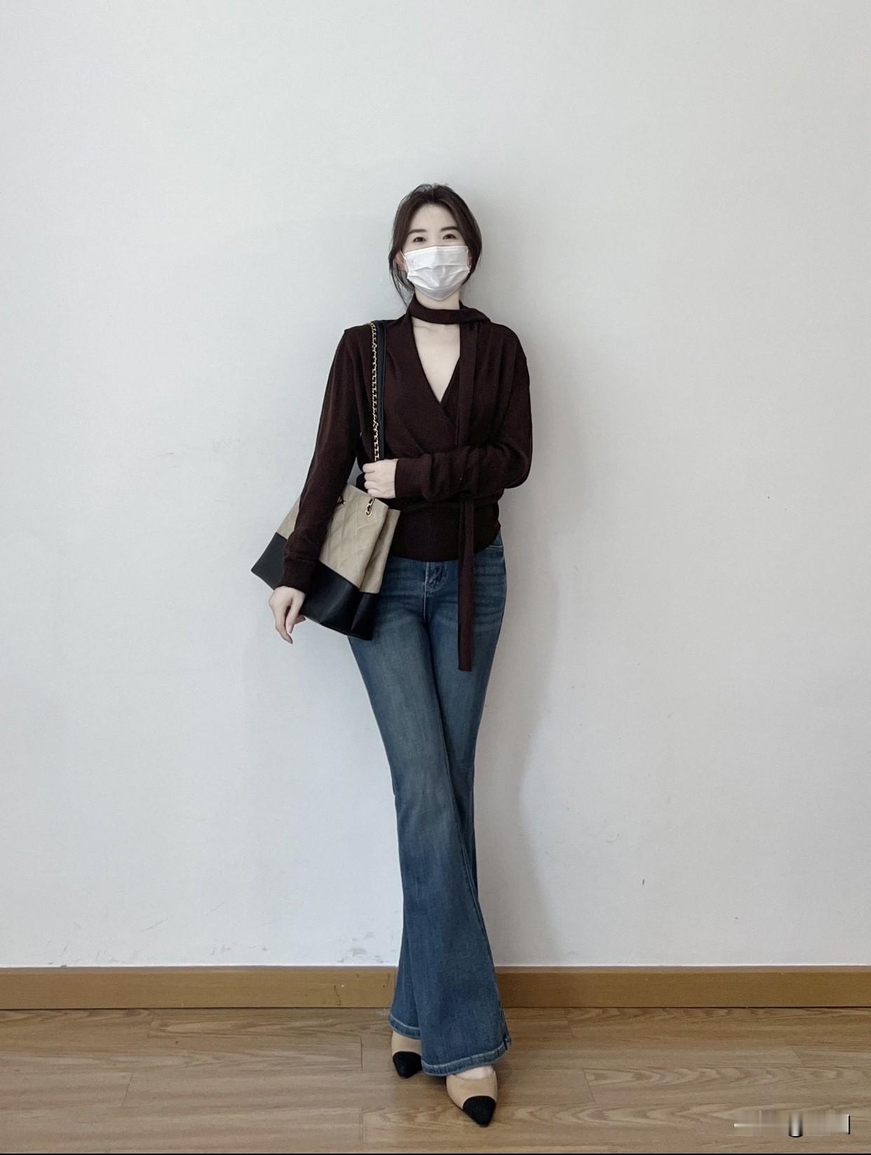 女生怎么穿紧身裤才好看简约时尚穿搭,紧身微喇牛仔裤+黑棕色上衣,搭配棕色拼接黑色