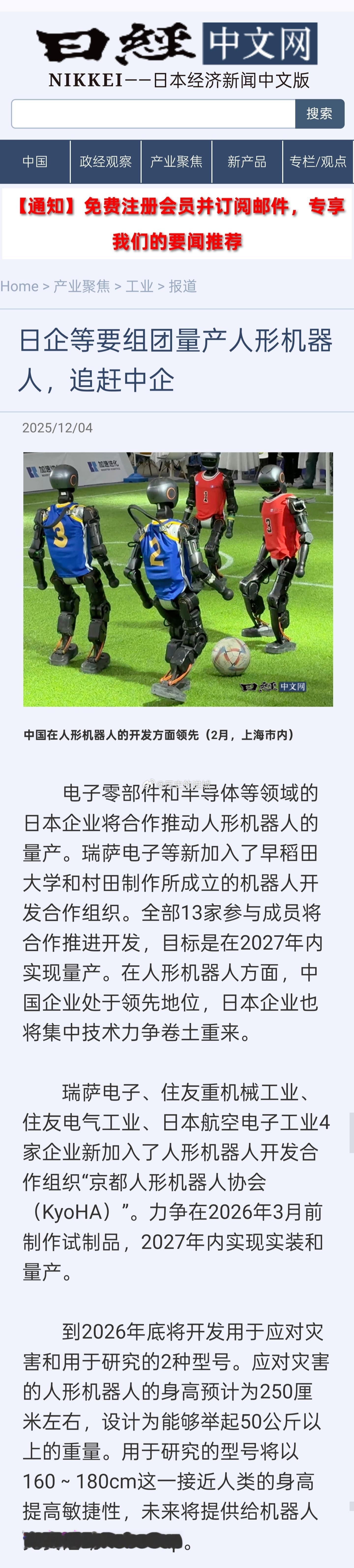瑞萨电子、住友重机械工业、住友电气工业、日本航空电子工业4家电子零部件和半导体等领域的日本企业新加入了人形机器人开发合作组织“京都人形机器人协会(KyoHA)”。力争在2026年3月前制作试制品,2027年内实现实装和量产。该组织全部13家参与成员将合作推进开发,目标是在2027年内实现量产。在人形机器人方面,中国企业处于领先地位,日本企业也将集中技术力争卷土重来。美国摩根士丹利预测称,2050年人形机器人的年销售额将扩大到5万亿美元规模。预计2025年达到30亿美元。在劳动力短缺的背景下,机器人代替劳动力备受期待。