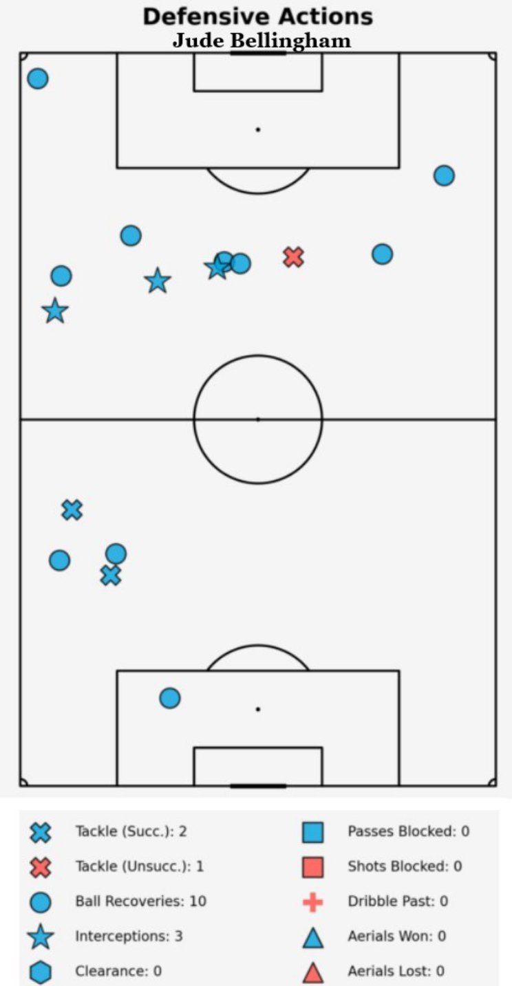 贝林厄姆的防守贡献🌟对阵毕尔巴鄂竞技- 7次抢断成功6次(全场第一)- 7次抢回球权(全场第二)- 1次拦截- 1次封堵传球近两场比赛在对方半场完成16次成功防守(对阵赫罗纳10次,对阵毕尔巴鄂竞技6次)。毕尔巴鄂竞技vs皇马