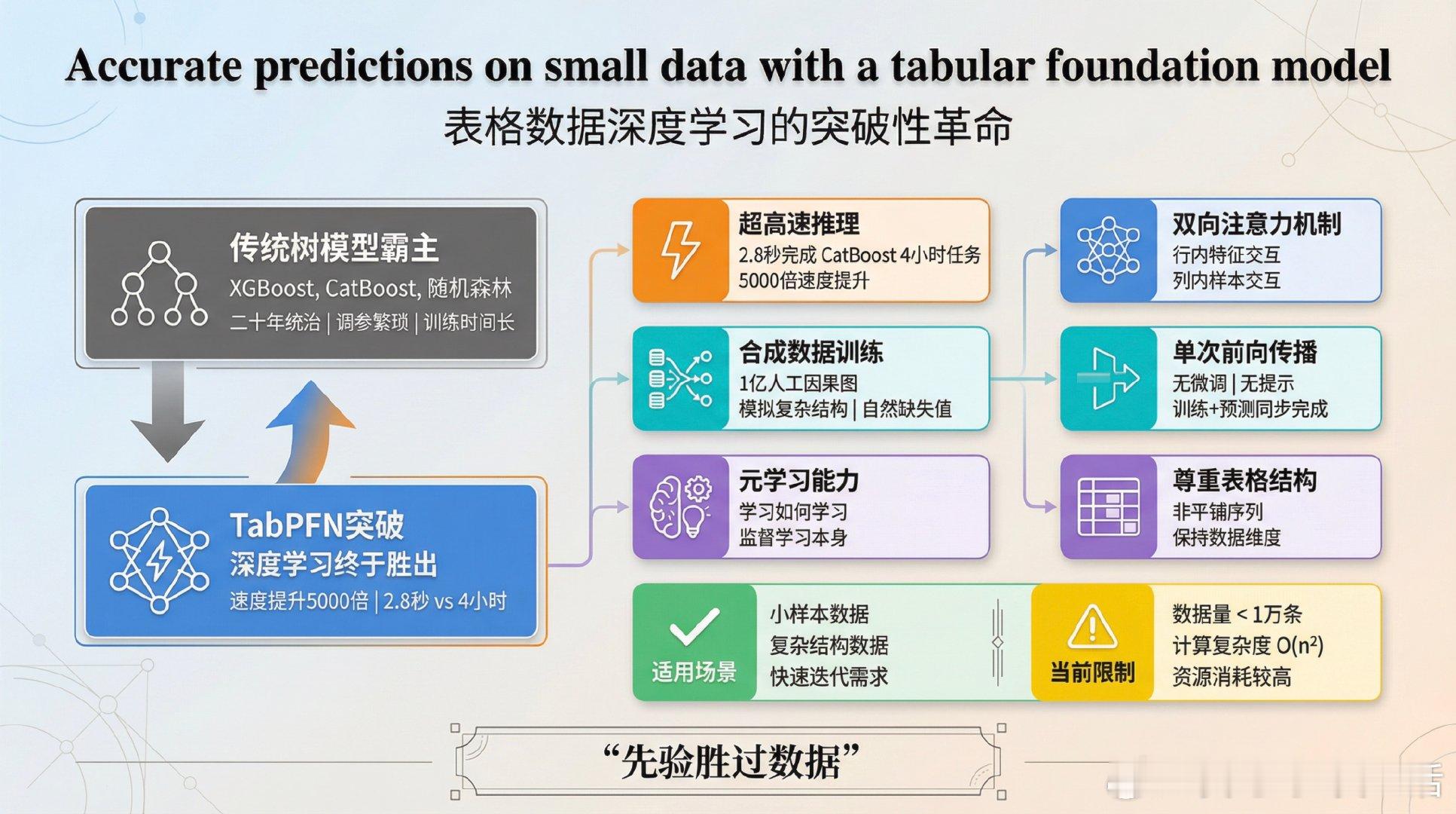 《Accurate predictions on small data with a tabular foundation model》这篇论文堪称突破性成果,解决了机器学习领域长期的尴尬——尽管深度学习在图像、文本和游戏领域横扫千军,传统基于树的方法(如XGBoost、CatBoost、随机森林)却在表格数据上稳坐霸主地位近二十年。表格数据是现实应用中最常见的数据格式,深度学习一直难以攻克。这篇发表在《Nature》上的论文带来了一个基础模型TabPFN,首次在小到中等规模数据集上,显著超越了树模型的表现,而且速度快得惊人。TabPFN仅用2.8秒就跑赢了需要调参4小时的CatBoost,速度提升了5000倍,这不仅是量变,而是质变。它的训练方式也极为创新:GPT靠海量网络文本训练,CLIP靠图文对训练,而TabPFN完全依赖合成数据——通过生成超过1亿个人工因果图数据集,模拟各种复杂结构。每个图通过不同的随机变换生成特征和目标,加上真实世界中常见的缺失值和异常值,模型在完全不见真实数据的情况下,学习到普适的预测策略。推理时,TabPFN也不走寻常路:它不微调、不提示,而是在一次前向传播中同时完成“训练”和预测。将带标签的训练集和无标签测试集一起输入,立即输出结果,无需梯度下降,因为模型预训练时已学会如何从示例中学习。其架构设计尊重表格结构,采用双向注意力机制——先在行内特征间,再在列内样本间进行交互,区别于将所有数据平铺为序列的传统Transformer。换句话说,这个Transformer已学会监督学习本身。这个突破的意义,不仅是深度学习终于在表格数据领域找到了“制胜之道”,更体现了“元学习”的力量——模型学习的是“如何学习”,而非单一模式。这是从单纯拟合数据到掌握学习算法的根本飞跃。当然,这项技术也有局限:目前TabPFN适用数据规模约为一万条以内,因其上下文窗口限制,计算复杂度为平方级别,难以直接替代百万级大数据场景的XGBoost。且其推理时比树模型更耗资源,不适合超高频实时预测。总结来看,TabPFN不是要取代树模型,而是为小样本、复杂结构数据提供了全新的、更快的解决方案,扩展了机器学习工具箱的边界。它是“先验胜过数据”的典范,开启了表格数据深度学习的新纪元。原文:x.com/burkov/status/1996102081996861907论文: www.nature.com/articles/s41586-024-08328-6.pdf