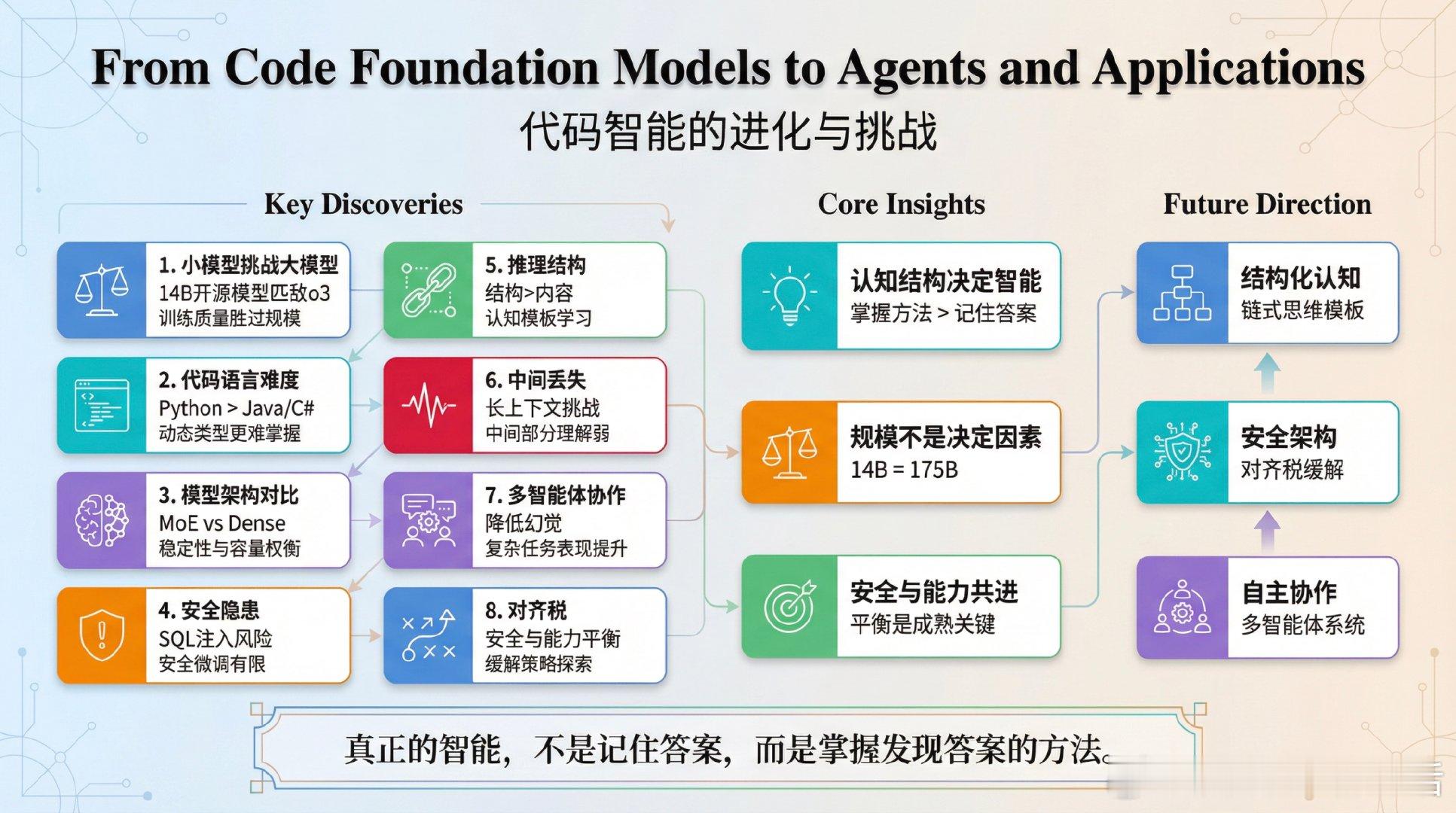 《From Code Foundation Models to Agents and Applications: A Practical Guide to Code Intelligence》本文揭示了代码生成模型和智能体训练中的多项关键发现,对AI发展有深远启示:1. 小型开源大模型(LLM)有望超越巨头。通过RLVR(可验证奖励强化学习)训练的14亿参数模型,在推理能力上能匹敌OpenAI的o3,证明模型规模不是唯一决定因素,训练质量和反馈机制更关键。2. 代码语言难度不一。Python因动态类型特性,反而比静态类型语言(如Java、C)更难学。类似语法语言混合训练带来协同效应,但Python与静态语言混合过多反而影响模型表现。3. MoE(专家混合)模型容量大但训练脆弱,超参数敏感;而Dense模型更稳定,训练更易把控。MoE需特殊学习率调度以防路由不稳定。4. 训练代码模型存在安全隐患。公开代码库中大量不安全编码模式被模型学习,安全微调效果有限。模型能拒绝写仇恨言论,却可能生成含有SQL注入漏洞的代码。5. 推理训练中“结构”远胜“内容”重要。模型通过学习链式思维(CoT)的“认知模板”,掌握问题拆解方法,而不是死记硬背事实。设计合成训练数据时,步骤结构比每条中间事实的准确性更关键。6. “中间丢失”问题依然存在。虽然支持超大上下文,模型对提示中间部分代码的理解仍不稳定,准确率下降。7. 多智能体辩论显著降低幻觉,提升复杂软件工程任务表现。但辩论设计需谨慎,否则可能引发幻觉强化。8. 安全对齐(alignment)往往牺牲代码能力,论文提出缓解“对齐税”的策略,期望安全与能力共进。这份研究颠覆了“规模即王道”的传统认知,真正的智能来自对认知结构和训练质量的深刻理解。AI的未来不在于参数多少,而在于训练方式、反馈机制和安全架构的精细设计。正如文中所说:“真正的智能,不是记住答案,而是掌握发现答案的方法。”链接:arxiv.org/pdf/2511.18538这不仅是一篇技术论文,更是AI进化的路线图。未来,AI模型将更注重结构化认知、稳定性、安全性与协作能力,推动智能系统迈向更高阶的自主推理与安全实践。对于AI工程师和研究者来说,这是一份必读的宝藏。思考:规模的迷思正在被理性取代,AI的价值在于“如何思考”,而非“记住多少”。安全与能力的平衡,是AI走向成熟的关键门槛。