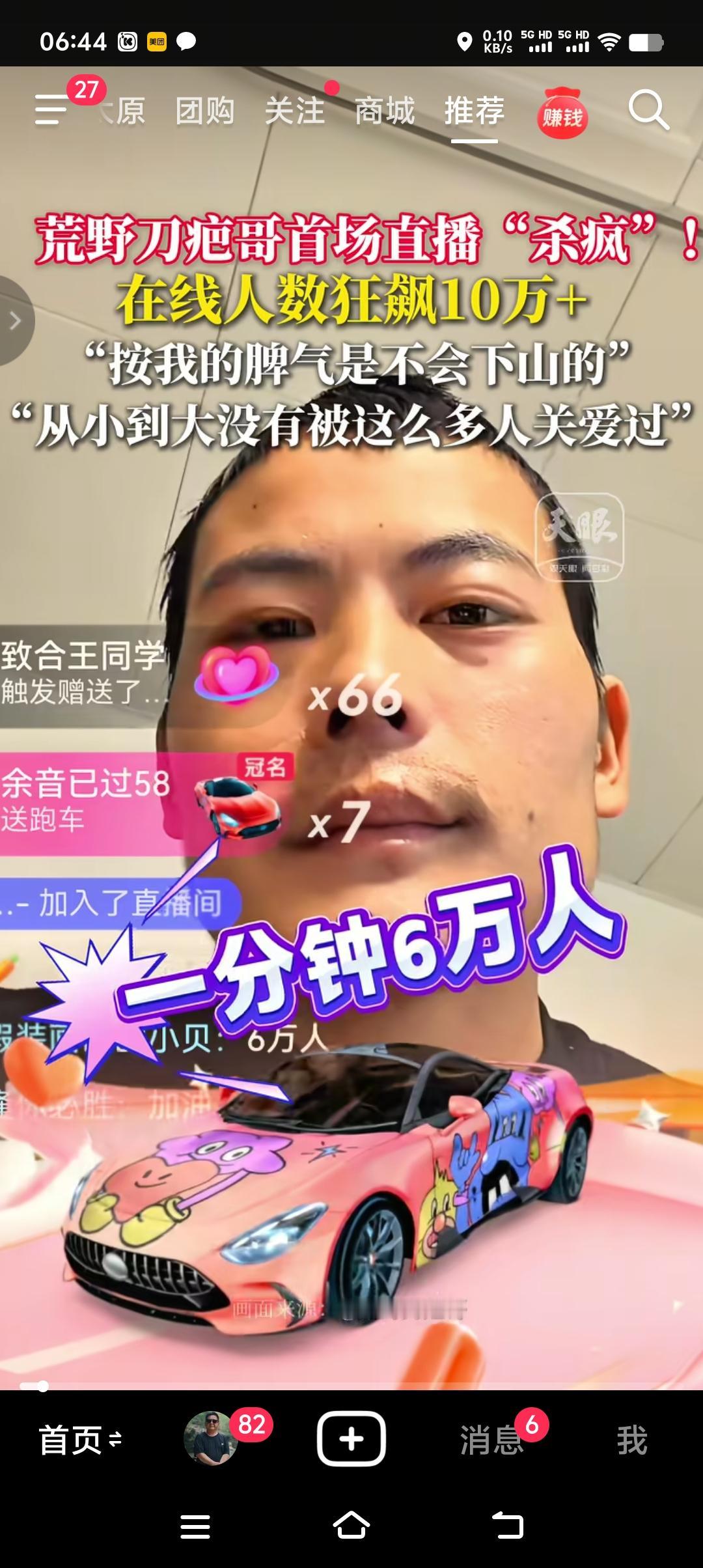 刀疤哥开直播了,可以说是前无古人后无来者,场面相当的震撼。开播仅两分钟,直播间人数直接干到10万加,真怀疑这些人是掐着点进来的。开播半小的,人气榜第一,百强榜第一。两小时直播,438万人在线观看,一亿加点赞,硬控两小时榜一。后台收了307万的礼物,扣除各种税净到手约84万,这些钱完全够刀疤哥盖房子了。 刀疤哥做梦也不会想到,自己就是生活在社会最底层的一个农民,一没文化,二没背景,三没才艺,何德何能一场直播挣自己一辈子想都不敢想的钱。如果不是主办方的“荒野求生”让全网认识了他,那么他的命运永远不会发生转变,永远是生活在贵州毕节的一个贫苦农民。所以说这就是网络的力量,流量的搏奕,背后资本的运作。有人说是刀疤哥的真诚、淳朴、遭遇得到了网民的共情,试问全网比他身世惨的人多下了,为什么没得到网民共情?说白了就是流量来了你就是一条龙,流量走了你就是一条虫。