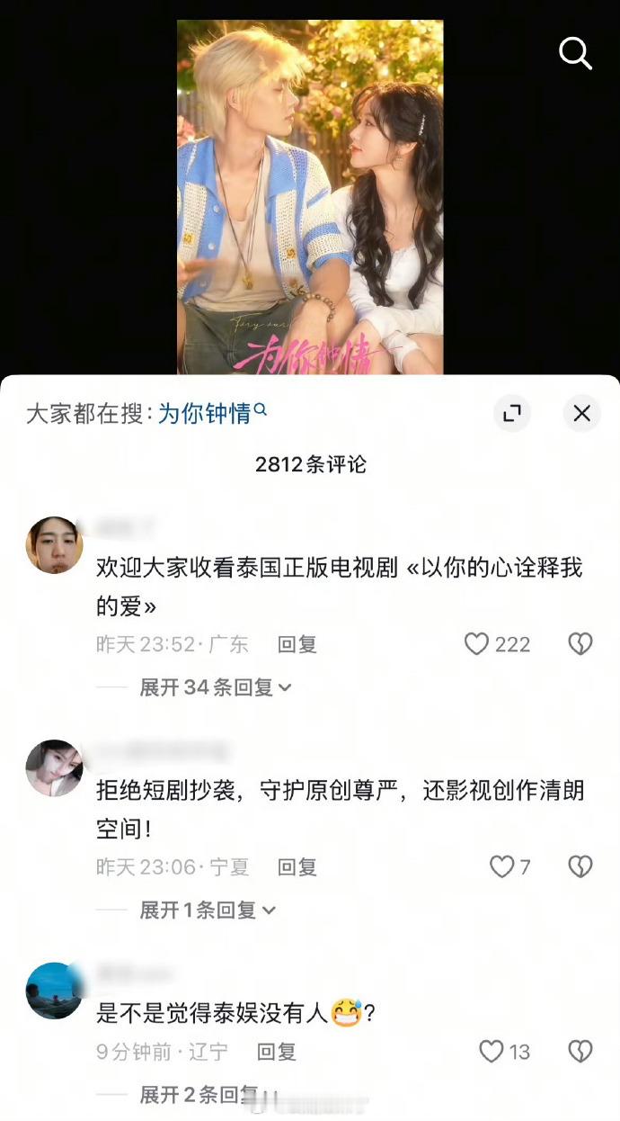 为你钟情短剧《为你钟情》因为抄袭泰剧导致广场被原作剧粉图了,短剧抄袭现象真的要管管了,演员可能演的时候根本不知道是抄袭的,最后却要背锅挨骂