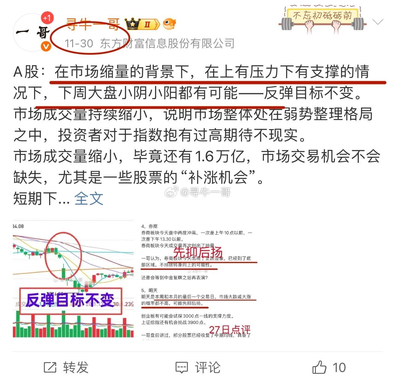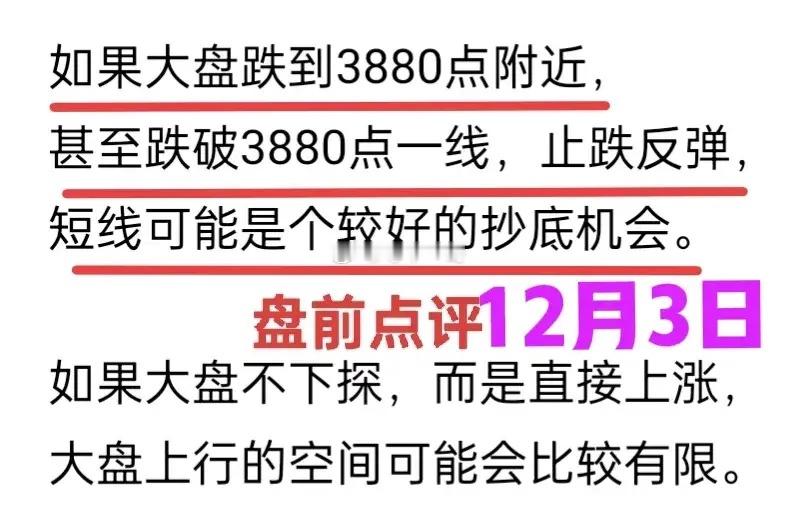 A股:大盘连续阴跌两天,似乎又到了短线抄底时刻,3860~3850点区域是短线重要支撑带。首先,一哥还是要明确一点,大盘中期调整还没有结束。无论是短线操作还是中线操作,把这个作为前提会更从容一些。一哥昨天的盘前观点:大盘跌到3880点,甚至跌破3880点,才可能有较好的反弹机会。昨天下午大盘最低3869点,跌破了3880点,但分时成交量没有放大,让渔夫对市场反弹产生了一丝疑虑。目前上证综指跌破了短期均线,而且昨天市场的成交金额比前一天放大了,是放量跌破均线。从这个角度来说,日线级别不太好看。分时级别,目前大盘还没有跌破3850点。之所以提到3850点,是因为11月25日的时候,大盘有个向上跳空缺口,这个缺口的下沿就在3850点一线。11月28日的时候,大盘最低跌到了3856点,没有回补11月25日的缺口。也就是说,在3850~3860点区域被有效跌破之前,并不能完全确认大盘就要Over了。另外,11月30日(上周末)的时候,一哥说了,由于市场整体成交量缩小,而且大盘处在一个上有压力下有支撑的局面,本周大盘大跌或大涨的概率都不大。预计今天大盘有效跌破3860~3850点区域的概率较低。如果大盘跌进了这个区域,有可能出现较好的短线反弹机会。对于普通投资者来说,现在难的是选择股票。因为目前市场整体还是震荡格局,今天收阳了,第二天可能就收阴,个股上涨的持续性较差。对于可能的短线机会,有把握就做,没把握不强迫自己交易。个人观点,仅供交流,不构成投资建议!理财有风险,投资需谨慎!大盘行情大盘分析行情A股行情a股今日看盘