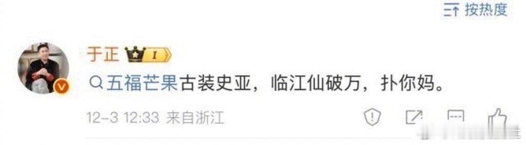 笑不活!于正又双叒破防怼人了!护剧心切反倒遭吐槽? 家人们谁看懵了!于正为护《临江仙》《五福临门》直接下场硬刚,张口就吹“《五福临门》是芒果史亚、《临江仙》破万”,这架势也是没谁了! 咱说于正确实拍过不少爆款好剧,编剧功底没话说,但这护剧脾气也太急了! 有事没事就下场较真怼人,本来剧的口碑还不错,一闹反倒让人觉得没必要。 好好搞创作不香吗?非要亲自下场撕,多少有点本末倒置~ 你们觉得于正这波操作是护剧还是败好感?