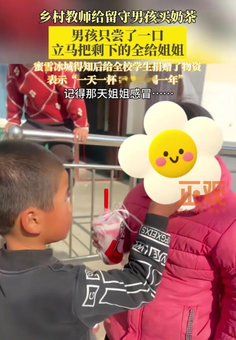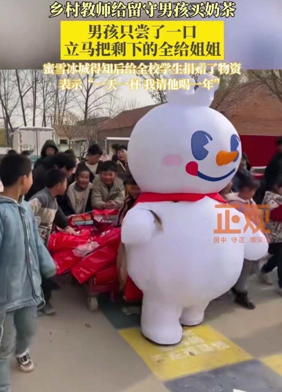 一乡村小学里的一位小男生 写下了想喝“蜜雪冰城”的愿望 被老师发现后 老师就去给他买了一杯蜜雪冰城的奶茶,帮助他实现愿望 男孩拿到后只喝了一小口就匆匆跑出教室 老师跟着他,发现他把奶茶给自己的姐姐喝了 蜜雪冰城官方看到视频后联系到了老师,没几天就带着大批文具还有一些保暖的物资来到学校 孩子们高兴的手舞足蹈 小小的奶茶,承载着孩子最纯粹的手足深情,品牌方的暖心回应,让善意延续,让爱照亮乡村校园的每个角落,让这份美好被看见、被延续,让爱心在传递中不断升温!