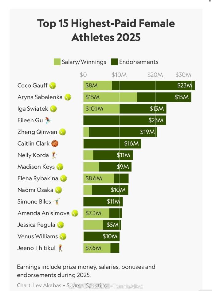 虎扑12月04日讯全球女运动员收入榜,高芙连续三年蝉联第一名,谷爱凌第四,郑钦文第五。网球运动员继续霸榜,2019年前十全部都是网球运动员,今年前十中也有七个位。