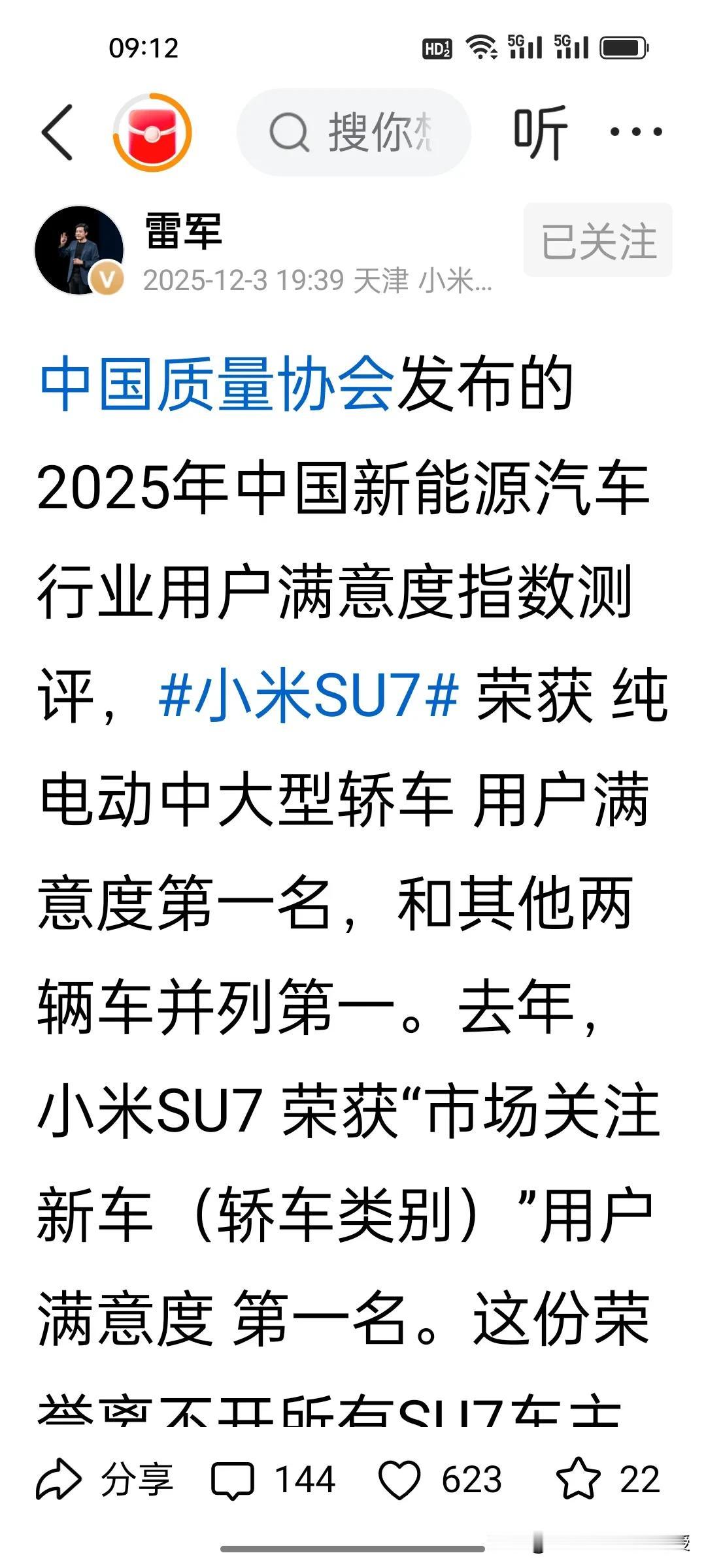 一觉醒来,小米拿了个“用户满意度第一”的荣誉,还是中国质量协会颁发的。雷军掩饰不住激动的心情发文。 雷军用这个奖来回击大众质疑,既显品牌底气,印证了小米汽车的产品力;但“并列第一”的细节也说明目前头部电动汽车之间市场竞争仍非常激励。 雷军将荣誉归于车主,既拉近用户距离又强化用户粘性。不过小米汽车目前仅在阿联酋试水,这份国内口碑未来能否转化为全球竞争力,还得看后续出海的落地表现。