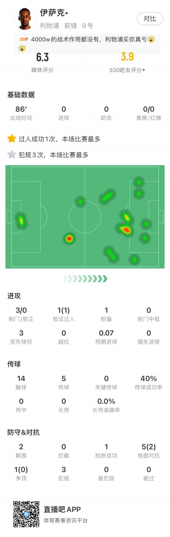 伊萨克此役先发,第86分钟被换下场,《利物浦回声报》点评道,伊萨克再次沦为可有可无的球员,捡残羹剩饭。