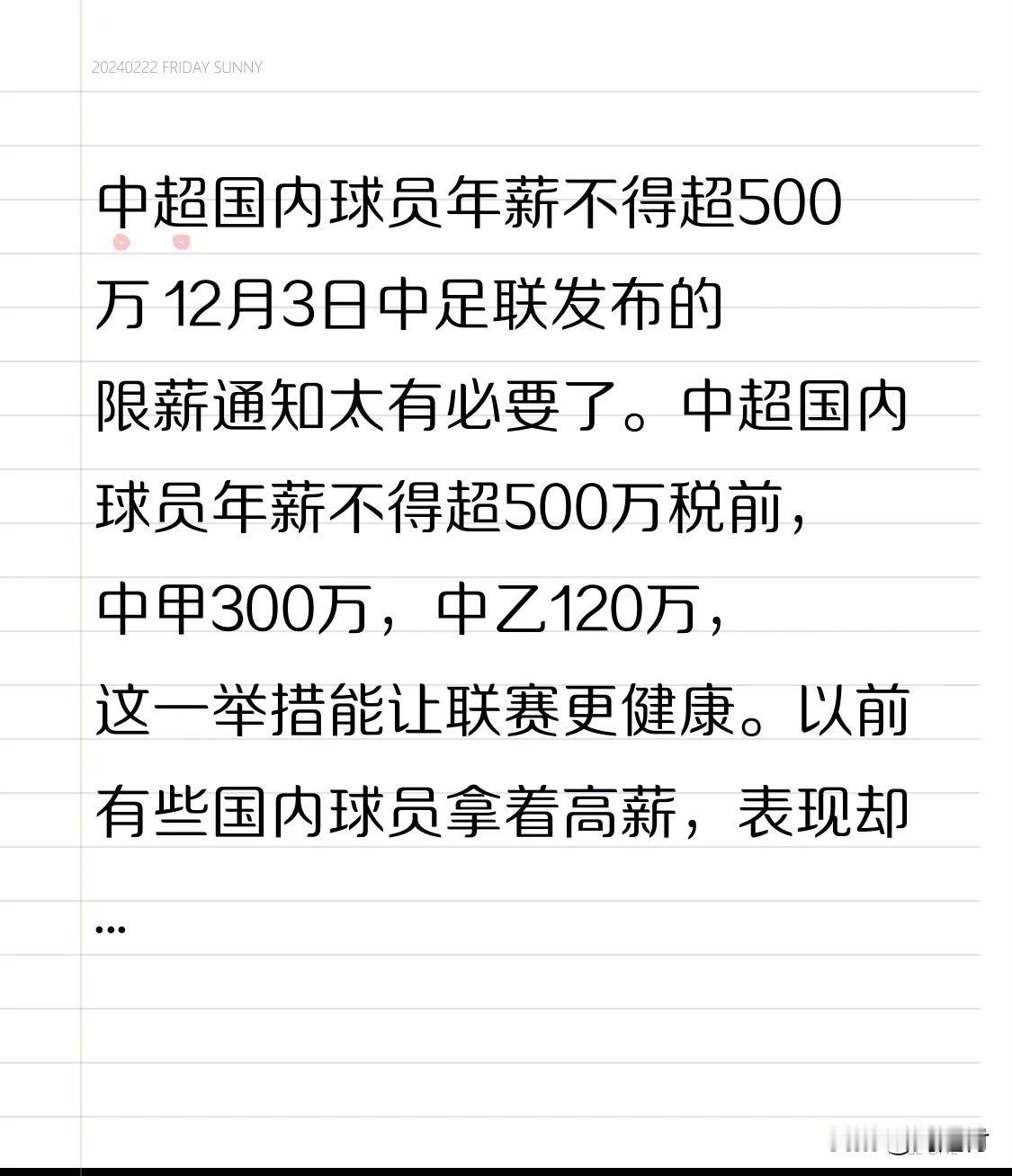 中超国内球员年薪不得超500万 中超国内球员年薪 不得超500万 12月3日 中足联发布限薪通知 太有必要了 中超国内球员 年薪税前不超500万 中甲300万 中乙120万 这一举措 让联赛更健康 以前 有些国内球员 拿着高薪 表现却差强人意 拿着巨额年薪 却踢不出成绩 对中国足球发展 毫无益处 限薪后 俱乐部支出 有了明确上限 中超不超6亿 中甲2亿 中乙5000万 还规定了 外援薪酬和球队赢球奖金 可避免 俱乐部盲目烧钱 让资源合理分配 说不定 能让球员 更有进取心 好好踢球 期待中国足球 借此迎来新发展 足坛月薪 中超转会费 中超待遇 国足薪资 足球工资 足球队员年薪 中国足球年薪