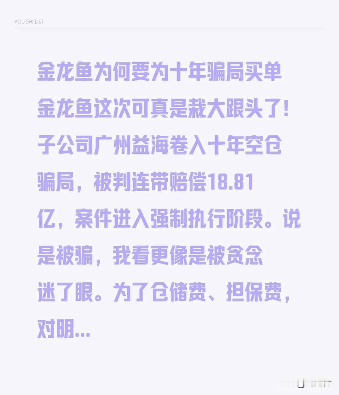 金龙鱼为何要为十年骗局买单 金龙鱼为何要为十年骗局买单 金龙鱼这次可真是栽大跟头了! 子公司广州益海卷入十年空仓骗局, 被判连带赔偿18.81亿, 案件进入强制执行阶段。 说是被骗, 我看更像是被贪念迷了眼。 为了仓储费、担保费, 对明显漏洞不管不顾。 甚至高管收好处费帮造假, 把风控当摆设。 想想看, 107万吨棕榈油, 仓库实际只能装16万吨, 这差距也太离谱。 近年它负面不断, 大米发霉、油有异物、售后推诿, 一次次伤了消费者的心。 如今18亿赔掉2024年七成净利润, 市值从7800亿跌到1600亿, 这就是漠视规则的代价。 大企业得守底线, 不然迟早翻车。 金龙鱼 食用油金龙鱼 外资金龙鱼 金龙鱼食用油 平凉金龙鱼广告 印尼金龙鱼 黄金龙鱼