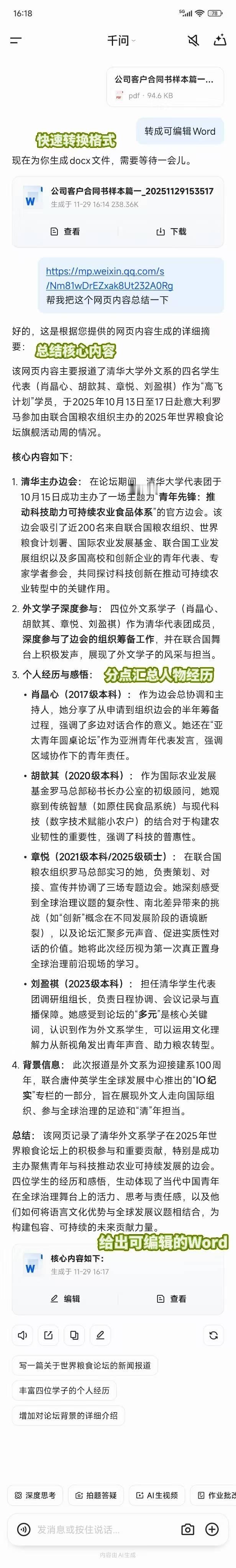 千问把office装进对话框PDF转Word,0翻车!工作时我经常会遇到转Word排版乱成狗,网页资料抄半天抓不住重点,赶DDL赶到崩溃…..这次千问app升级太给力了,客户发的PDF合同要改字,我把文件扔给千问,并说 “转成可编辑Word”,表格、图片全还原,排版丝毫不乱。搞定复杂网页资料也很快,比如我将搜到的网页链接发给千问,说一句 “帮我把这个网页内容总结一下”,两步秒出精简版,再也不用逐字扒网页了。升级后的千问,在对话框里,从写作创作到格式转换到资料提炼,几分钟搞定原本1小时的活,真正让打工人少做无用功,这才是职场人该有的打工神器!
