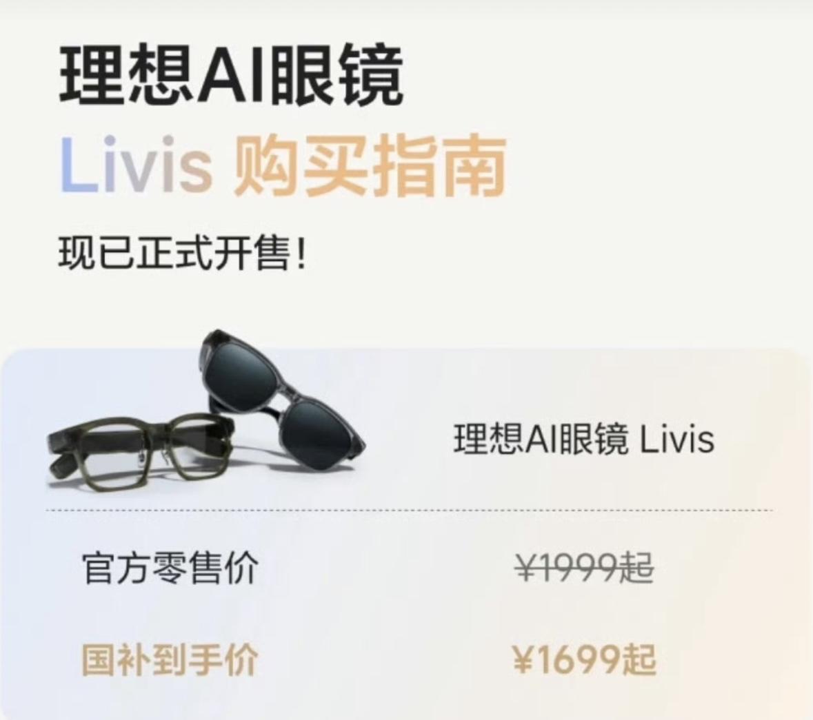 理想汽车首款AI眼镜Livis,能拍视频,能听歌,能接打电话,有语音助手,重36克,支持眼镜盒充电,Android 8.0 或 iOS 15.0 及以上版本使用。国补价格1699元。