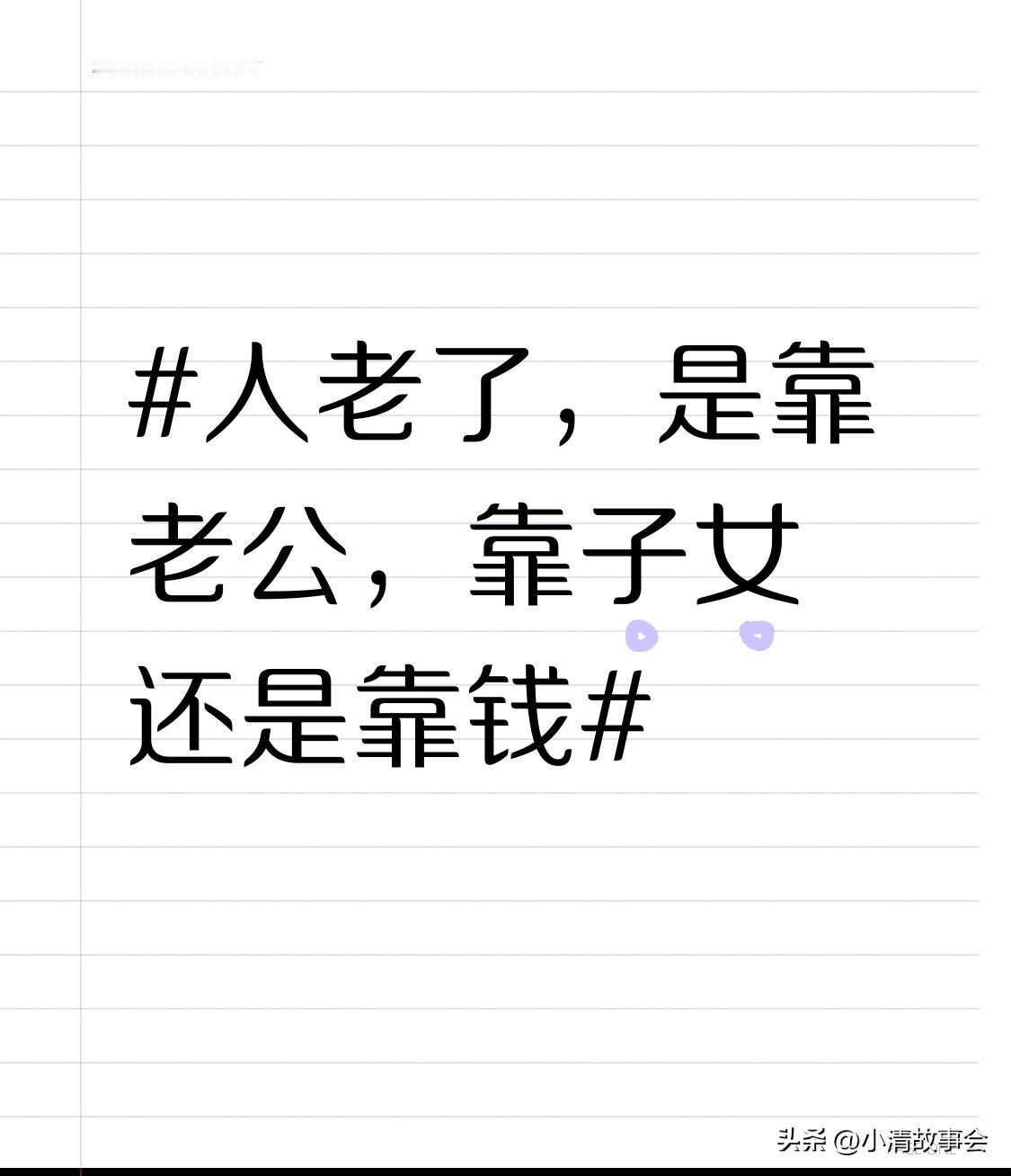 人老了,靠老公、子女还是钱,这问题真挺现实。 靠老公,年轻时携手走过风雨,老来相互陪伴是很美好。他知道你爱吃啥、怕啥,起夜能扶一把,生病能递杯水。可年纪大了,谁也保不准身体咋样,要是他身体比你还差,或者感情变疏远,就指望不上了。 靠子女,“养儿防老”观念深入人心,但他们有自己的生活和压力,能偶尔看望、打个电话就不错,不好过多拖累。 相比之下,钱才最靠谱。看病不求人,消费不看脸色,请护工也有底气。人老了,钱能给尊严,让人活得硬气。所以啊,还是得有点钱傍身。