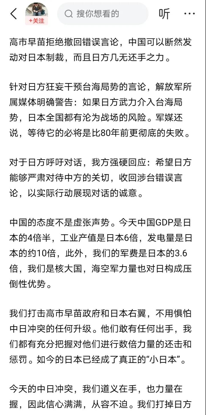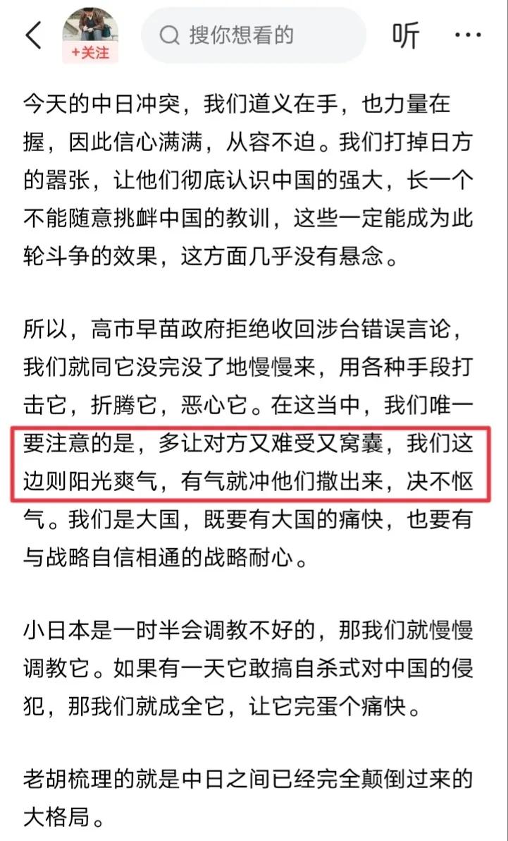 近日,胡锡进对我们打击日本的挑衅给出了一个注意事项“多让对方又难受又窝囊,我们这边……决不怄气”。 不得不说,胡锡进表面上要让日方受气而我们不怄气,看似完美无暇,但实际上有可能吗?如果我们对日本发动经济或者文化制裁,日本就会对等反击,我们能不怄气吗?真按照胡锡进说的我们不能怄气的原则,恐怕只剩打嘴炮、过嘴瘾这种口头动作,仿佛老胡在精神上就胜利了似的。 但是打嘴炮、过嘴瘾这种口头动作会让日本真的受气吗?就会让高氏某苗撤回狂妄言论吗?且来看看从前日本究竟有没有真正受气。 日本已经霸占琉球几十年,而我们几十年都未统一台湾。请问胡锡进,这种情况是让日本受气还是让我们怄气呢? 靖国神社供奉着多位甲级战犯,每年数以万计的日本人参拜神社,而我们只能口头抗议日本政客的参拜行为。请问胡锡进,这种情况是让日本受气还是让我们怄气呢? 日本在历次战争中掠夺了上百万件中国文物,且迄今均未归还,而我们为了研究相关文物,只能向日本博物馆申请探视。请问胡锡进,这种情况是让日本受气还是让我们怄气呢? 那么胡锡进一厢情愿地认为可以做到让日方受气而我们不怄气,老胡仅仅满足于口头谴责几句就够了吗?