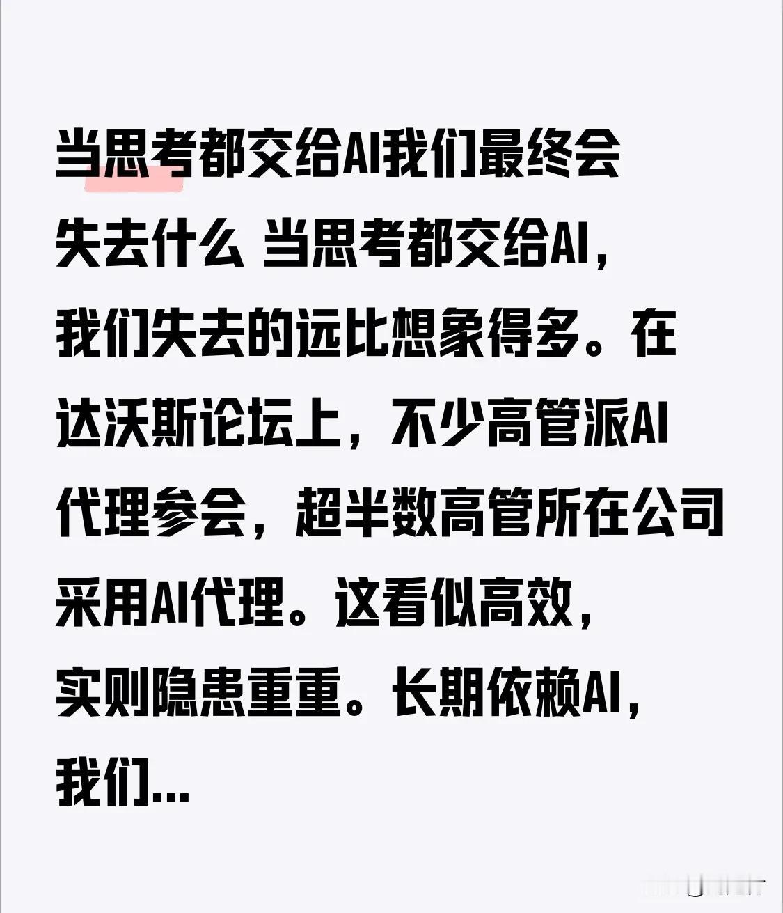 当思考都交给AI我们最终会失去什么 当思考都交给AI 我们最终会失去什么 当思考都交给AI 我们失去的远比想象得多 在达沃斯论坛上 不少高管派AI代理参会 超半数高管所在公司采用AI代理 这看似高效 实则隐患重重 长期依赖AI 我们的认知与思维能力会退化 大脑前额叶活跃度下降 出现“AI脑雾” 83%用AI写作的人记不住自己内容 批判性思维也会钝化 默认AI输出为“标准答案” 创造力和表达也会丧失 被局限在已知领域 表达风格趋同 而且决策能力弱化 责任意识淡化 AI虽有优势 但人类的思考和创造力不能被替代 否则我们将失去作为人的核心特质 AI对工作影响 AI发展战略 ai误区 ai代替了谁 AI思维模型